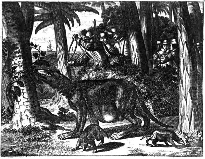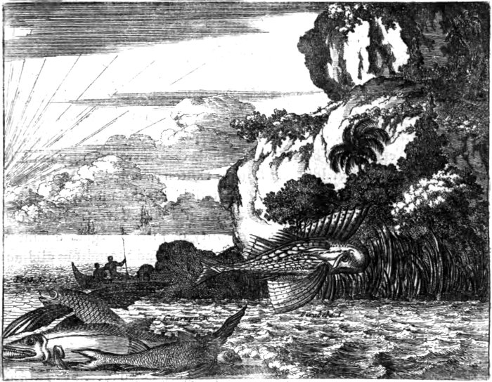 Then the Dog-Fish, which lifting up its Head out of the Sea, Barks, and letting forth its young ones, receives them into her Belly again, when they have sported a while in the Sea.
