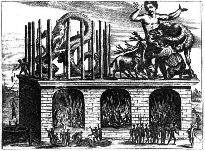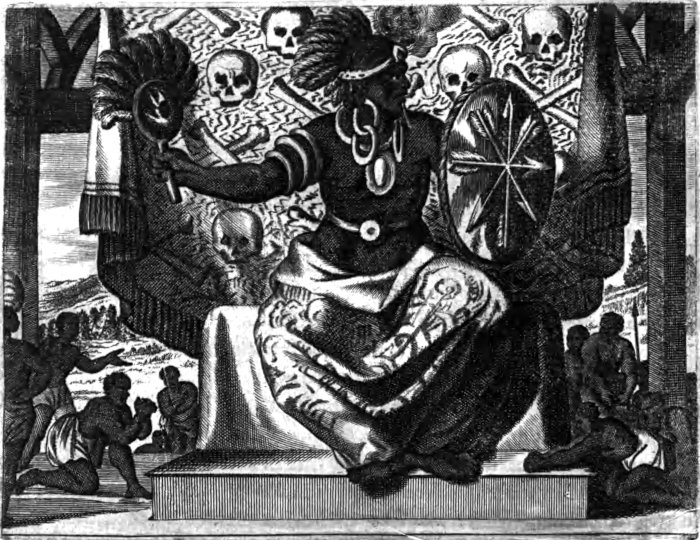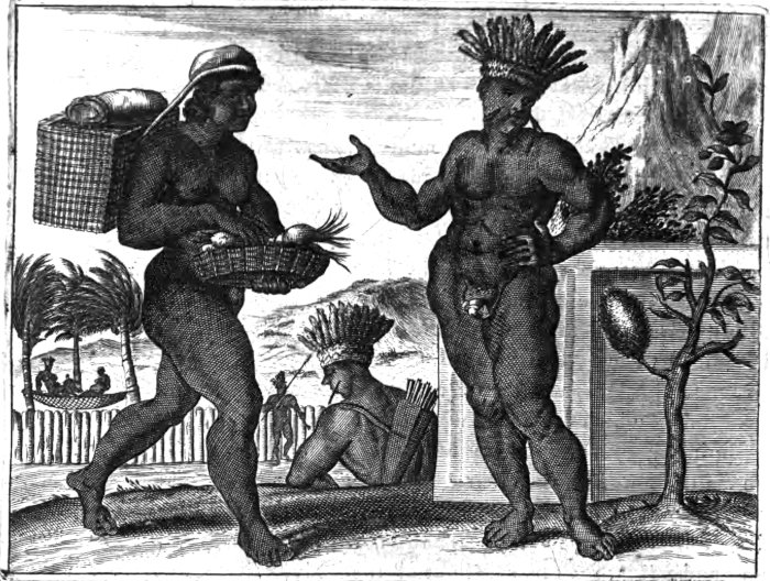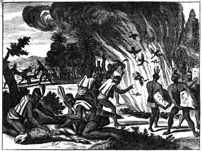 The Ships Sailing from hence, ran along a broken Coast, and on the twelfth of April were so terribly shaken by an Earthquake, which lasted an hour and a half, that they seem’d shivering to pieces in the Water, as if they had ran against a 659Rock, notwithstanding they could not fathom Ground with their longest Line. Somewhat farther they discover’d a burning Mountain on an Island, between which and the Main (on which stood also a very high Mountain) they steering their Course, came into a white Water, mov’d by a strong River from the Continent; and coming to an Anchor before the Island Jamna, they saw the Isles Moa and Arimoa before them. The Jamneans calling New Guinee by the Name of Belah, inform’d the Hollanders, that they Warr’d continually with the Inhabitants thereof. These People being also Coal-black, some of them had loose curl’d Hair, hanging down over their Shoulders in long Braids, and others had onely two thick Locks, which cover’d their Ears; all of them wore four Feathers on their Heads: the Men pull’d out their Beards, and hung a great Bone Ring through their Ears, at which also hung a Shell like a Spur; most of them had red Roses ty’d about their Heads, and a Necklace of Hogs Teeth about their Necks; under their Navels they wore Girdles, a handful and a half broad, and about their Wastes Strings full of Shells, or Sea-Cockles, to which a small Lappet was ty’d, and hung down before their Privities; but because it was but two Fingers broad, and mov’d to an again by the Wind, their Nakedness appear’d to those that took notice thereof; through the Gristle of their Noses they wore a Hogs Tooth, or the Splinter of a Cane. Upon the Stern of their small Boats was the Shape of a little Lyon. One of these Islanders imitated the Hollanders when they spoke, endeavoring to repeat their words after them, and therefore was call’d Parrot.