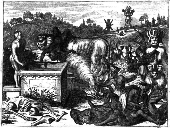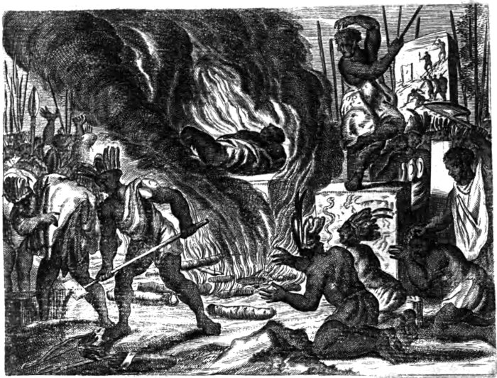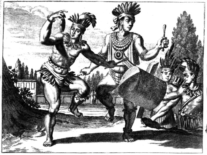 As for the Manners and Customs of the Natives, they are by the said Description represented to be a kind of Samoid, or wandring People, still moving from place to place, warlike and active, using Slings and Darts with marvellous dexterity, of a brown Complexion for the most part, and of an indifferent Stature, eating their Meat either quite raw, or onely a little parboyl’d, Clothing themselves with the Skins of such Beasts, or other Creatures, as they kill, especially Seals, or some of the largest size of Fowls, which they Dress very smooth and soft, turning the Feather or Hair side outwards in Summer, and inward in Winter. Their Weapons Bowes, Slings, and Bone or Iron-headed Darts; their Religion Idolatrous, but chiefly Sun-Worship, as was gather’d from their manner of Accost, when any of the English first approach’d them, for they us’d to point up to the Sun, as chief Author of their felicity, and then beat their Breasts, crying, Iliont, which seem’d to signifie as much as I mean no harm, and would not come near till those that met them did the like. Their Houses built of Whales Bones, and the Baulks thereof with Whales Ribs, and cover’d with Earth, but the best sort with Seal-Skins, having Vaults or 665Rooms under Ground, four-square, and two Yards deep in the Earth. Their manner of Burial, a Pile of Stones thrown over the Corps, being first wrapt up in Seal-Skins.