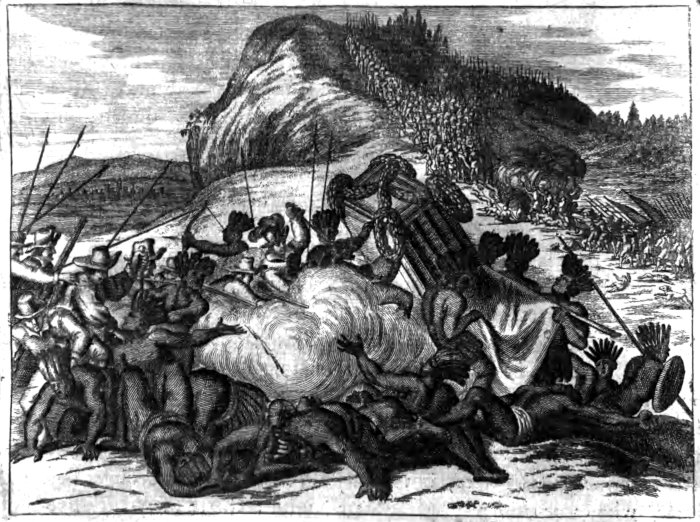 The Coast of Iseland hath many strange and monstrous Fish worth observation, 667as first the Orca, which though nothing near so big as the Whale, yet is able to be the death of it; for being of the shape of a Ship turn’d upside-down, and having sharp long Fins on its Back, it pricks the Belly of the Whale therewith till it kills.