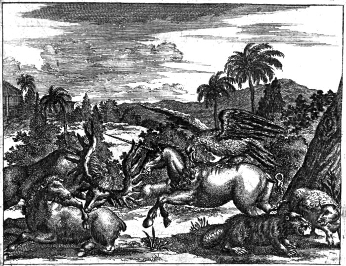 The Beasts, which are said to breed here in great numbers, are Horses, Deer, Foxes, Hares, Bears, both black and white, common Wolves, and a sort of Beast between a Deer and a Wolf, besides great store of Beavers and Martins, as the Iseland Chronicle testifies, whose Furr in fineness may compare with the Sables of Russia. There are also Gerfalcons in abundance, both white and grey, of so delicate a kind, that they were in ancient times sent to the Kings of Denmark as Presents of great rarity.