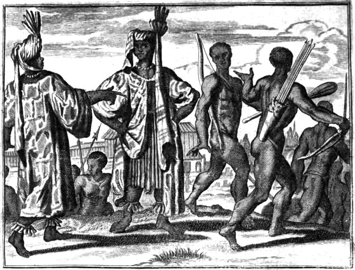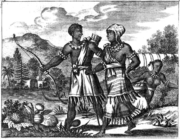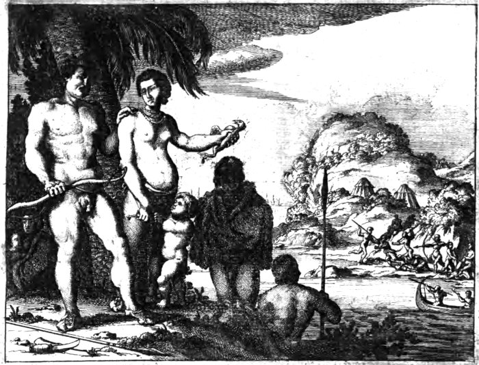 658Sailing from hence, they discover’d two low Islands full of Trees; and three Leagues from them, on their Star-board, a high Coast, and on the other side a great Island, whither they drove with a small Gale; approaching the same, two very small Boats came towards the Hemskerk; the biggest of the two carry’d six Men, and the least three, all of them very deform’d; they went stark naked, onely their Yards were ty’d up with a String on their Bellies, and about their Arms hung Chains of Mother-of-Pearl; they were Coal-black, onely red about the Mouth, which redness was occasion’d by the chewing of Pisang; in their Hair stuck woodden Combs, and on their Foreheads green Leaves; but in each Boat was one who had a bruised Reed made fast in his Neck like a Plume; the biggest Vessel was Painted with strange Shapes of Men and Beasts; they us’d red Bowes and Arrows, and having call’d to the Seamen, they Row’d back again to the Shore; which Tasman left a Stern of him, and ran between the Main Coast (by all suppos’d to be New Guinee) and several great Islands, that lay scatter’d along before the Main Coast; from whence came four small Boats, adorn’d with Imagery like Serpents, but kept without Gun-shot from the Ships; at last one leaping overboard, swam to the smallest Boat, out of which one swam back in his stead to the other, and afterwards came to the Hemskerks side; he was a black Man, wore Leaves before his Privities, and Armlets about his Elbows; through the Gristle of his Nose stuck a white Bone Bodkin, sharp at the ends, and of a Fingers length, and about his Neck a String full of Cockle-shells.