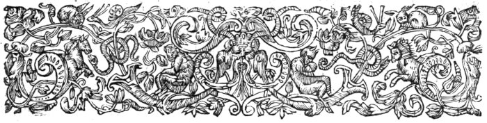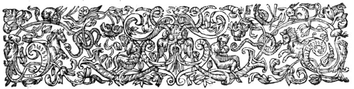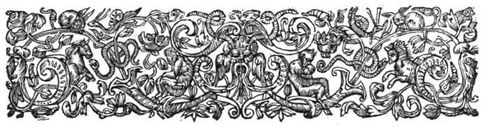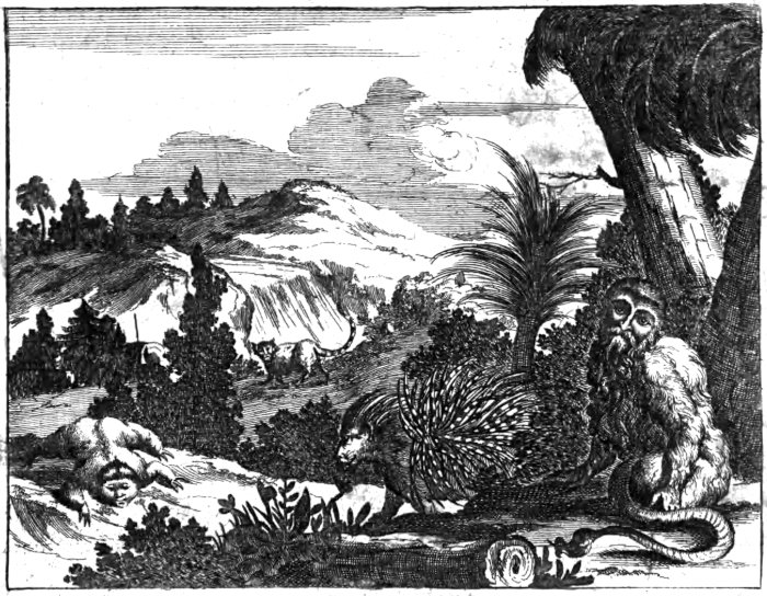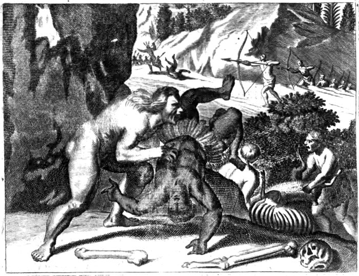 In the Journal of Dithmar Blefkens’s Voyage, mention is made of a certain blind Monk, brought up in the Monastery of St. Thomas, who reported several memorable things concerning this Countrey, as that it was call’d Groenland antiphrastically, or by contrariety of Speech, as appearing seldom or never green; and that it abounded with Bears and white Foxes, and was not without Pygmies and Unicorns, which never appear’d till after the Sun was entred into Aries; that in the said Monastery of St. Thomas there was a Fountain of scalding Water, which was convey’d through Pipes of Stones to the Monks several Cells, and serv’d them not onely for Stoves, but for the dressing of their Meat, which was as well boyl’d by means of this Water, as if it had been over a real Fire, and that the Walls of the Monastery were made of a kind of Pumice-stone, upon which if Water were pour’d, it would produce a slimy Matter, commonly us’d in stead of Lime for Mortar, like the Stone of Mount Hecla in Iseland; that two of these Pygmies, a Male and a Female, were kept by the Abbot, and were both endu’d with perfect humane Shape, and overgrown with Hair, even to the outermost Joynts of their Fingers, the Male especially, who had a Beard reaching down to his Knees, but that they seem’d wholly devoid of Reason and Understanding, nor had any distinct use of Speech, onely made a semblance of Hissing of the manner of Geese; lastly, he reported the duration of the Lives of these Creatures to be answerable to the shortness of their Stature; but that concerning their Wars with the Cranes, he had no other knowledge than by Tradition.
