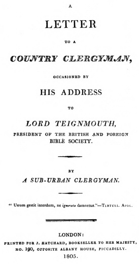 But now, Sir, to business. You open your Address to Lord Teignmouth with a preamble, which sets forth, that you are “not inclined, for several reasons, to describe the emotions of your mind upon the receipt of his Lordship’s Address, as President of the British and Foreign Bible Society.” There is an air of mystery in these words, which recommended them strongly to my notice; and if you do me the favour to turn back to my first page, you will find that I have employed them as you have done, in fronte operis. I am, however, upon reflection, inclined to think that “there is,” to use your own words upon another occasion, “more of sound than sense” in this affectation of reserve on both sides. For, to say the truth, I have already revealed my emotions, and I am sure you have taken no pains to conceal p. 5yours: and yet it must be manifest that if each of us had not been inclined to do it, neither of us would have done it. However, the preamble has its use; for it invites the reader to believe, that we are both of us men of peace and charity, and very unwilling to injure the feelings and reputation of our neighbour: an assumption which, in your case, it was the more necessary to make; as otherwise the reader of your pages might, innocently enough, have concluded the reverse.