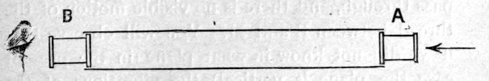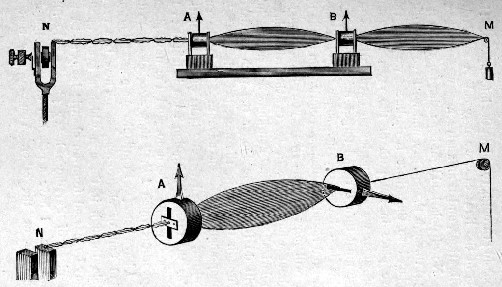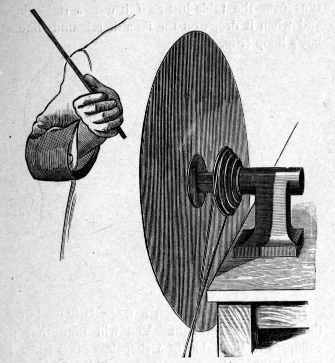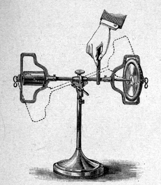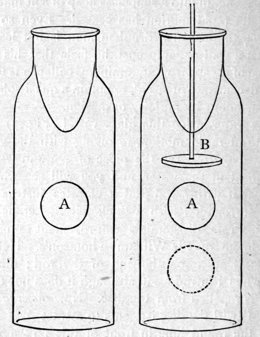 The water inside this glass vessel (Fig. 3) is in a state of rapid motion, revolving with the vessel itself. Now observe the piece of paraffin wax A immersed in the water, and you will see when I push at it with a rod that it vibrates just as if it were surrounded with a thick jelly. Let us now apply Prof. Fitzgerald's improvement on this experiment of Sir William Thomson's. Here is a disc B stuck on the end of the rod; observe that when I introduce it, although it does not touch A, A is repelled from the disc. Now observe that when I twirl the disc it seems to attract A.