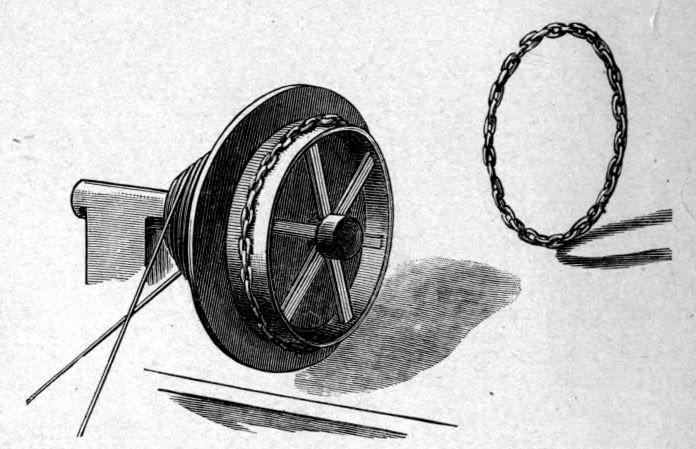 Here again is a ring of chain which is quite flexible. It seems ridiculous to imagine that this {16}could be made to stand up like a stiff hoop, and yet you observe that when I give it a rapid rotation on this mandril and let it slide off upon the table, it runs over the table just as if it were a rigid ring, and when it drops on the floor it rebounds like a boy's hoop (Fig. 2).