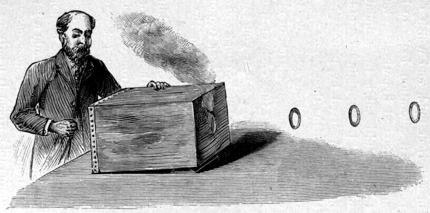 It was Rankine, the great guide of all engineers, who first suggested the idea of molecular vortices in his explanations of heat phenomena and the phenomena of elasticity—the idea that every particle of matter is like a little spinning top; but I am now speaking of Thomson's theory. To imagine that an atom of matter is merely a {20}curiously shaped smoke-ring formed miraculously in a perfect fluid, and which can never undergo permanent alteration, looks to be a very curious and far-fetched hypothesis. But in spite of certain difficulties, it is the foundation of the theory which will best explain most of the molecular phenomena observed by philosophers. Whatever be the value of the theory, you see from these experiments that motion does give to small quantities of fluid curious properties of elasticity, attraction and repulsion; that each of these entities refuses to be cut in two; that you cannot bring a knife even near the smoke-ring; and that what may be called a collision between two of them is not very different in any way from the collision between two rings of india-rubber.