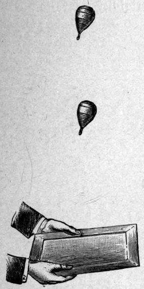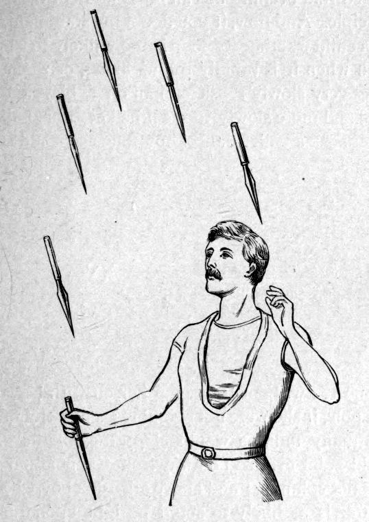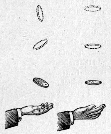 I once showed some experiments on spinning tops to a coffee-drinking, tobacco-smoking audience in that most excellent institution, the Victoria Music Hall in London. In that music hall, things are not very different from what they are at any other {27}music hall except in beer, wine, and spirits being unobtainable, and in short scientific addresses being occasionally given. Now, I impressed my audience as strongly as I could with the above fact, that if one wants to throw a quoit with certainty as to how it will alight, one gives it a spin; if one wants to throw a hoop or a hat to somebody to catch upon a stick, one gives the hoop or hat a spin; the disinclination of a spinning body to let its axis get altered in direction can always be depended upon. I told them that this was why smooth-bore guns cannot be depended upon for accuracy;[4] that the spin which an ordinary bullet took depended greatly on how it chanced to touch the muzzle as it just left the gun, whereas barrels are now rifled, that is, spiral grooves are now cut inside the barrel of a gun, and excrescences from the bullet or projectile fit into these grooves, so that as it is forced along the barrel of the gun by the explosive force of the powder, it must also spin about its axis. Hence it leaves the gun with a perfectly well-known spinning motion about which there can be no doubt, and we know too that Fig. 10 shows the {28}kind of motion which it has afterwards, for, just like the hat or the biscuit, its spinning axis keeps nearly parallel to itself. Well, this was all I could do, for I am not skilful in throwing hats or quoits. But after my address was finished, and after a young lady in a spangled dress had sung a comic song, two jugglers came upon the stage, and I could not have had better illustrations of the above principle than were given in almost every trick performed by this lady and gentleman. They sent hats, and hoops, and plates, and umbrellas spinning from one to the other. One of them threw a stream of knives into the air, catching them and throwing them up again with perfect precision and my now educated audience shouted with delight, and showed in other unmistakable {29}ways that they observed the spin which that juggler gave to every knife as it left his hand, so that he might have a perfect knowledge as to how it would come back to him again (Fig. 11). {30}It struck me with astonishment at the time that, almost without exception, every juggling trick performed that evening was an illustration of the above principle. And now, if you doubt my statement, just ask a child whether its hoop is more likely to tumble down when it is rapidly rolling along, or when it is going very slowly; ask a man on a bicycle to go more and more slowly to see if he keeps his balance better; ask a ballet-dancer how long she could stand on one toe without balancing herself with her arms or a pole, if she were not spinning; ask astronomers how many months would elapse before the earth would point ever so far away from the pole star if it were not spinning; and above all, ask a boy whether his top is as likely to stand upright upon its peg when it is not spinning as when it is spinning.