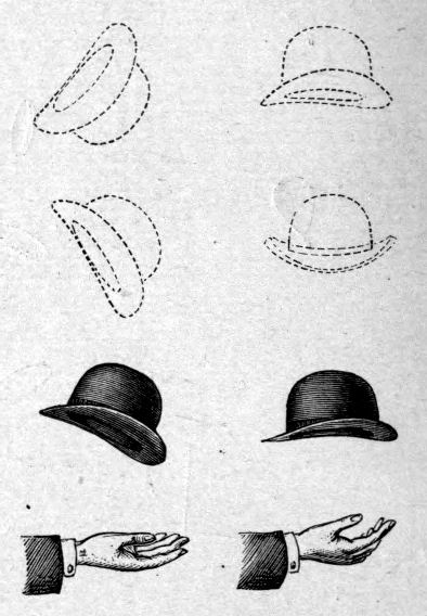 Here again is a very soft hat, specially made for this sort of experiment. You will note that it collapses to the table in a shapeless mass when I lay it down, and seems quite incapable of resisting forces which tend to alter its shape. In fact, there is almost a complete absence of rigidity; but when this is spun on the end of a stick, first note {17}how it has taken a very easily defined shape; secondly, note how it runs along the table as if it were made of steel; thirdly, note how all at once it collapses again into a shapeless heap of soft material when its rapid motion has ceased. Even so you will see that when a drunken man is not leaning against a wall or lamp-post, he feels that his only chance of escape from ignominious collapse is to get up a decent rate of speed, to obtain a quasi-sobriety of demeanour by rapidity of motion.