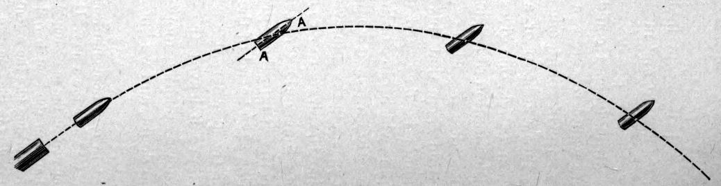 As an illustration of this, consider the spinning projectile of Fig. 10. The spin tends to keep its axis always in the same direction. But there is a defect in the arrangement, which you are now in a {37}position to understand. You see that at A the air must be pressing upon the undersurface A A, and I have to explain that this pressure tends to make the projectile turn itself broadside on to the air. A boat in a current not allowed to move as a whole, but tied at its middle, sets itself broadside on to the current. Observe this disc of cardboard which I drop through the air edgewise, and note how quickly it sets itself broadside on and falls more slowly; and some of you may have thrown over into the water at Aden small pieces of silver for the diving boys, and you are aware that if it were not for this slow falling of the coins with a wobbling motion broadside on, it would be nearly impossible for any diving boy to get possession of them. Now all this is a parenthesis. The {38}pressure of the air tends to make the projectile turn broadside on, but as the projectile is spinning it does not tilt up, no more than this gyrostat does when I try to tilt it up, it really tilts out of the plane of the diagram, out of the plane of its flight; and only that artillerymen know exactly what it will do, this kind of windage of the projectile would give them great trouble.