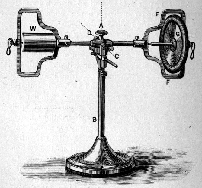 The first phenomenon is most easily studied in this balanced gyrostat (Fig. 13). You here see the fly-wheel G in a strong brass frame F, which is supported so that it is free to move about the vertical axis A B, or about the horizontal axis C D. The gyrostat is balanced by a weight W. Observe that I can increase the leverage of W or diminish it by shifting the position of the sleeve at A so that it will tend to either lift or lower the gyrostat, or exactly balance it as it does now. You must observe exactly what it is that we wish to study. If I endeavour to push F downwards, with the end of this stick (Fig. 14), it really moves horizontally to the right; now I push it to the right (Fig. 15), and it only rises; now push it up, and you see that it goes to the left; push it to the left, and it only goes downwards. You will notice that if I clamp the instrument so that it cannot move vertically, it moves at once horizontally; if I prevent mere horizontal motion it readily moves vertically when I push it. Leaving it free as {34}before, I will now shift the position of the weight W, so that it tends continually to lift the gyrostat, and of course the instrument does not lift, it moves horizontally with a slow precessional motion. I now again shift the weight W, so that the gyrostat would fall if it were not spinning (Fig. 16), and it now moves horizontally with a slow precessional motion which is in a direction opposed to the last. These phenomena are easily explained, but, {35}as I said before, it is necessary first to observe them carefully. You all know now, vaguely, the fundamental fact. It is that if I try to make a very quickly spinning body change the direction of its axis, the direction of the axis will change, but not in the way I intended. It is even more curious than my countryman's pig, for when he wanted the pig to go to Cork, he had to pretend that he was driving the pig home. His rule was a very {36}simple one, and we must find a rule for our spinning body, which is rather like a crab, that will only go along the road when you push it sidewise.