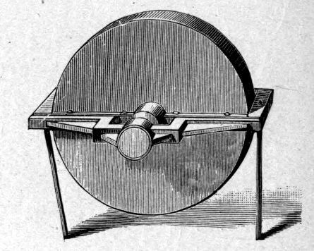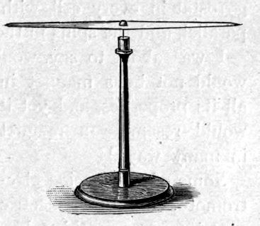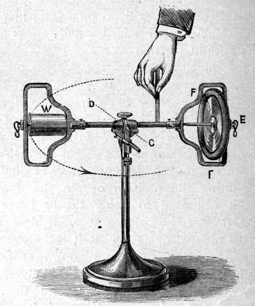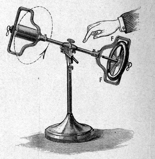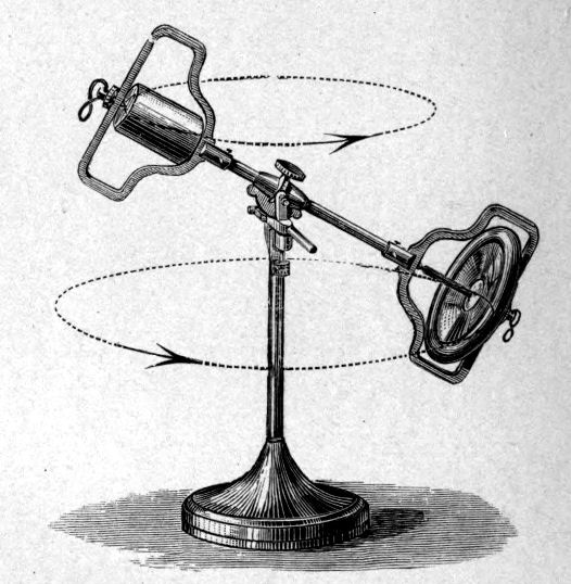 Nearly all the experiments, even the tops and other apparatus you have seen or will see to-night, have been arranged and made by my enthusiastic assistant, Mr. Shepherd. The following experiment is not only his in arrangement; even the idea of it is his. He said, you may grin and contort your body with that large gyrostat in your hands, but many of your audience will simply say to {24}themselves that you only pretend to find a difficulty in turning the gyrostat. So he arranged this pivoted table for me to stand upon, and you will observe that when I now try to turn the gyrostat, it will not turn; however I may exert myself, it keeps pointing to that particular corner of the room, and all my efforts only result in turning round my own body and the table, but not the gyrostat.