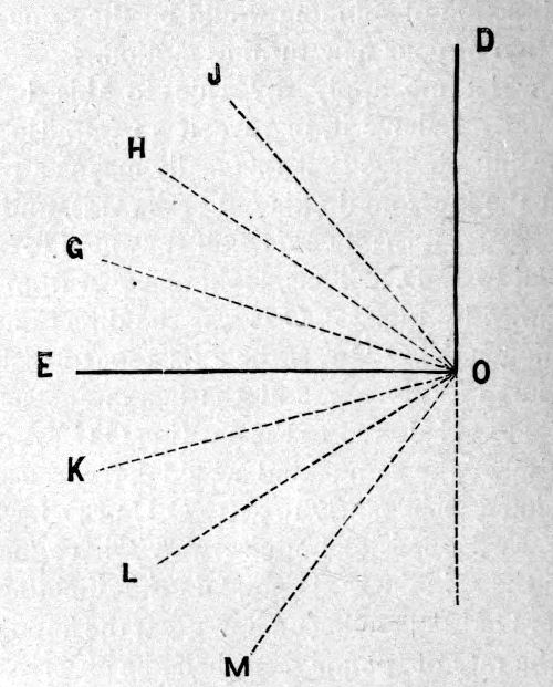 Now let me apply my rule to this balanced gyrostat. I shove it, or give it an impulse downwards, but observe that this really means a rotation about the horizontal axis C D (Fig. 13), and hence the gyrostat turns its axis as if it wanted to become parallel to C D. Thus, looking down from above (as shown by Fig. 20), O E was the direction of the spinning axis, O D was the axis about which I endeavoured to move it, and the instantaneous effect was that O E altered to the position O G. A greater impulse of the same kind would have caused the spinning axis instantly to go to O H or O J, whereas an upward opposite impulse would have instantly made the spinning axis point in the direction O K, O L or O M, depending on how great the impulse was and the rate of spinning. When one observes these phenomena for the first time, one says, "I shoved it down, and it moved to the right; I shoved it up, and it moved to the left;" but if the direction of the spin were opposite to what it is, one would say, "I shoved it down, and it moved to the left; I shoved it up, and it moved to the right." The simple {44}statement in all cases ought to be, "I wanted to rotate it about a new axis, and the effect was to send its spinning axis towards the direction of the new axis." And now if you play with this balanced gyrostat as I am doing, shoving it about in all sorts of ways, you will find the rule to be a correct one, and there is no difficulty in predicting what will happen.