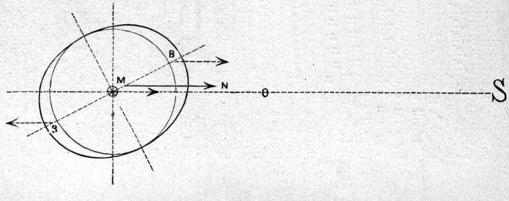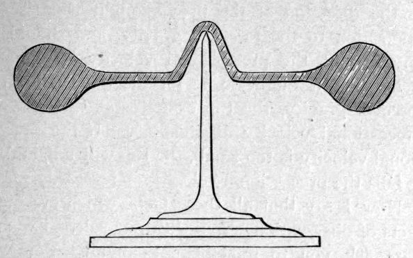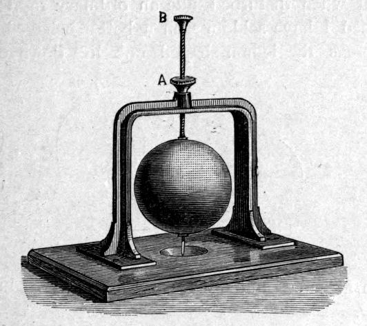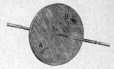 If we have a spinning ball and we give to it a new kind of rotation, what will happen? Suppose, for example, that the earth were a homogeneous sphere, and that there were suddenly impressed upon it a new rotatory motion tending to send Africa southwards; the axis of this new spin would have its pole at Java, and this spin combined with the old one would cause the earth to have its true pole somewhere between the present pole and Java. It would no longer rotate about its present axis. In fact the axis of rotation would be altered, and there would be no tendency for anything further to occur, because a homogeneous sphere will as readily rotate about one axis as another. But if such a thing were to happen to this earth of ours, which is not a sphere but a flattened spheroid like an orange, its polar diameter being the one-third of one per cent. shorter than the equatorial diameter; then as soon as the new axis was established, the axis of symmetry would resent the change and would try to become again the axis of rotation, and a great wobbling motion would ensue. {55}I put the matter in popular language when I speak of the resentment of an axis; perhaps it is better to explain more exactly what I mean. I am going to use the expression Centrifugal Force. Now there are captious critics who object to this term, but all engineers use it, and I like to use it, and our captious critics submit to all sorts of ignominious involution of language in evading the use of it. It means the force with which any body acts upon its constraints when it is constrained to move in a curved path. The force is always directed away from the centre of the curve. When a ball is whirled round in a curve at the end of a string its centrifugal force tends to break the string. When any body keyed to a shaft is revolving with the shaft, it may be that the centrifugal forces of all the parts just balance one another; but sometimes they do not, and then we say that the shaft is out of balance. Here, for example, is a disc of wood rotating. It is in balance. But I stop its motion and fix this piece of lead, A, to it, and you observe when it rotates that it is so much out of balance that the bearings of the shaft and the frame that holds them, and even the lecture-table, are shaking. Now I will put things in balance again by placing another piece of lead, B, on the side of the spindle remote from A, and when I again rotate the disc (Fig. 26) there {56}is no longer any shaking of the framework. When the crank-shaft of a locomotive has not been put in balance by means of weights suitably placed on the driving-wheels, there is nobody in the train who does not feel the effects. Yes, and the coal-bill shows the effects, for an unbalanced engine tugs the train spasmodically instead of exerting an efficient steady pull. My friend Professor Milne, of Japan, places earthquake measuring instruments on engines and in trains for measuring this and other wants of balance, and he has shown unmistakably that two engines of nearly the same general design, one balanced properly and the other not, consume very different amounts of coal in making the same journey at the same speed.