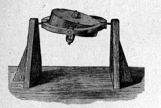 The first phenomenon will be observed in this case which I have already shown you. This case (Fig. 5), {33}with the fly-wheel inside it, is called a gyrostat. When I push the case it does not bow down, but slowly turns round. This gyrostat will not exhibit the second phenomenon; it will not rise up again if I manage to get it out of its upright position, but, on the contrary, will go precessing in wider and wider circles, getting further and further away from its upright position.