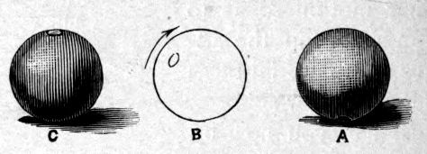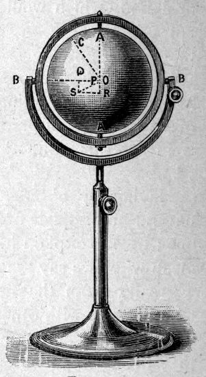 To this globe I have given two rotations simultaneously. Suppose a little being to exist on this globe which could not see the gymbals, but was able to observe other objects in the room. It would say that the direction of rotation is neither about O A nor about O B, but that the real axis of its earth is some line intermediate, O C in fact.