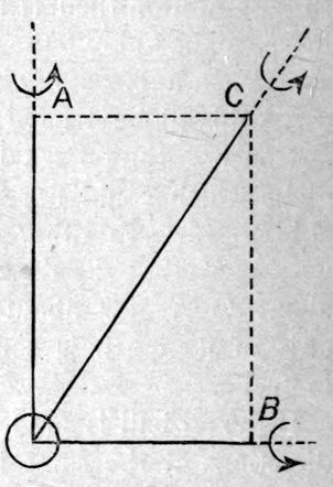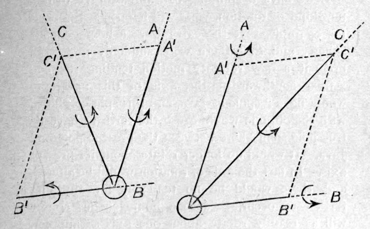 Observe that if the rotation about the axis O A is with the hands of a watch looking from O to A, the rotation about the axis O B looking from O to B, must also be with the hands of a watch, and the resultant rotation about the axis O C is also in a direction with the hands of a watch looking from O to C. Fig. 25 shows in two diagrams how necessary it is that on looking from O along either O A or O B, the rotation should be in the same direction as regards the hands of a watch. These constructions are well known to all who have studied elementary mechanical principles. Obviously if the rotation about O A is very much greater than the rotation about O B, then the position of the new axis O C must be much nearer O A than O B.