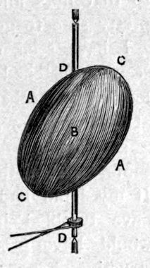 If a rotating body is in balance, not only does the axis of rotation pass through the centre of gravity (or rather centre of mass) of the body, but {57}the axis of rotation must be one of the three principal axes through the centre of mass of the body. Here, for example, is an ellipsoid of wood; A A, B B, and C C (Fig. 27) are its three principal axes, and it would be in balance if it rotated about any one of these three axes, and it would not be in balance if it rotated about any other axis, unless, indeed, it were like a homogeneous sphere, every diameter of which is a principal axis.