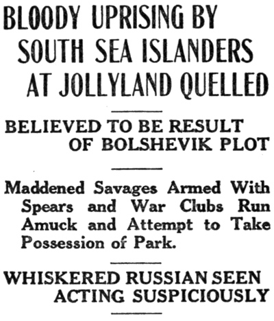 A great free open-air spectacle was in process of preparation at Jollyland under the supervision of a famous moving picture director who specialized in that form of animated art technically known as “serials.” He had personally conducted a gazelle-eyed cinema celebrity known as June Delight through four fifteen reel affairs of this sort in which she had been threatened with mayhem, aggravated assault and battery, felonious wounding, and total and complete annihilation at the hands of numerous bands of cut-throats, bandits, thieves and white slavers. In the course of these proceedings she had performed every breath-catching feat that the festive imagination of the director had been capable of conjuring up and had succeeded, by a miracle, in keeping out of both the hospital and the obituary columns of the daily press.