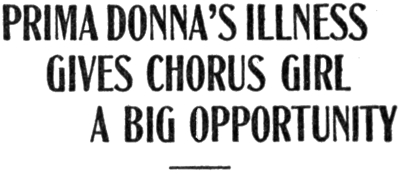 Miss June Delight summoned Manager McClintock to her dressing room just before the Saturday night performance and successfully simulated the classic symptoms of impending nervous prostration while she sniffed at a vial of smelling salts and submitted to the ministrations of a tired maid who gently massaged her forehead with her finger-tips. Miss Delight, in a voice that was barely audible, informed the manager that she could not possibly endure the trying ordeal of further performances after that evening without a brief period of rest and that she was leaving for a week’s stay at a sanitarium on the following morning.