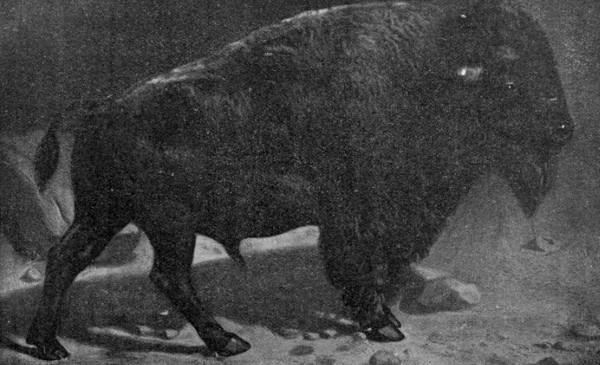 As the early forenoon wore away, it became quite warm. I stopped the oxen, took off my coat, and fastened it to the pack on the yoke. Starting again, I walked behind the patient, plodding old oxen for an hour or more, when we approached some breaks. At this time I judged I was much more than half the distance from camp to where I was going. Presently the oxen raised their heads, sniffing the air; they turned a little to the left and increased their speed. I knew at once they had winded water. I followed after them, but upon going a few rods farther the oxen broke into a trot, and about the time they did so we were on the brink of a downward slope, and close to a large pool of water, just west of us, with a bald low butte on the west side of the water. As the oxen trotted [Pg 331] faster, I decreased my gait to a slow walk. I saw the oxen rush into the water, belly-deep, stop, and commence drinking. I was nearly 200 yards behind them. My cartridge-belt was chafing my hips. I stopped to buckle the belt another hole tighter, when all at once about 100 buffaloes came thundering down the slope from the northeast, in a mad rush for the water. Seemingly I was not noticed at all by them, but before they got fairly into the water the old "whoa-haws" (as the Indians called oxen) bolted and whirled to the southwest,—and away they went, out of the water, up the steep slope which joined onto the butte jutting down to the water. It seemed that at the same instant the oxen stampeded, the buffalo whirled around towards a northwest direction; and off they went, up the slope, on the north end of the square bluff butte, but not until I had noticed that the velocity of motion of the rear of the herd, by their sudden impact, had knocked down several of their number at the edge of the water. I stood looking at this spectacular scene in amused wonderment. It all occurred so suddenly that I remember laughing outright.