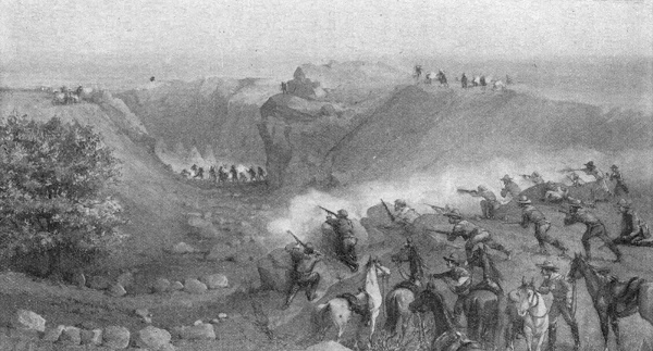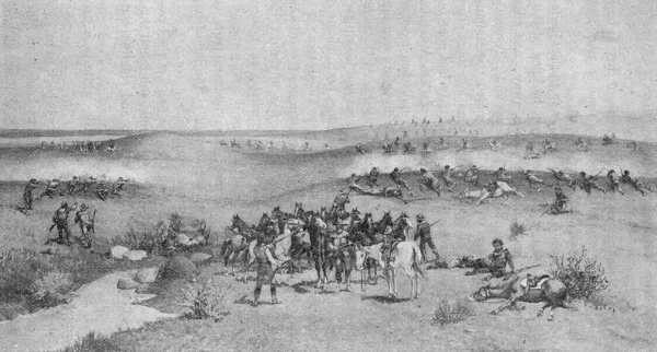 He was nearly a mile from wood and water. The two Indians saw the predicament he was in, and they circled in between him and the South Pease river. He unhitched his team, hobbled them close to the wagon, laid down flat upon the ground, crawled like a snake towards a break to the right of him, and when 300 yards from his outfit he wriggled himself into a deep buffalo-wallow in the edge of a prairie-dog town. And here he lay, peeping out on the flat and waiting events.