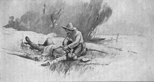 The hill in the break towards which he had been crawling was less than 200 yards from him. While lying here, his quick, alert ear and steady eye taking everything around him, and his mind busy evolving a way out of his present predicament, a large diamond rattlesnake came crawling obliquely just in front of him from a near-by prairie-dog hole. Not wishing to disclose his position to the Indians by shooting the snake, he suddenly pressed the heavy gun-barrel down on the snake, about six inches back of its head. Pressing the gun down hard with his left hand, he took his wiping-stick in his right hand and played a tattoo on its head until he had killed it. All the time he was doing this the body was wriggling and writhing, while the rattlers kept the ever zee-zee-zz-z until death.