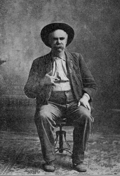 His picture shows the loss of his trigger finger; done by Missouri bushwhackers. Yet he trained the middle finger to pull trigger, and told the author, in 1907, that he could shoot just as well as ever.