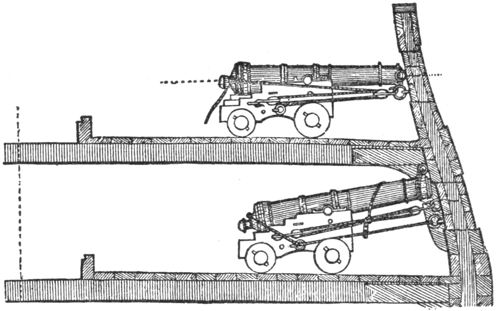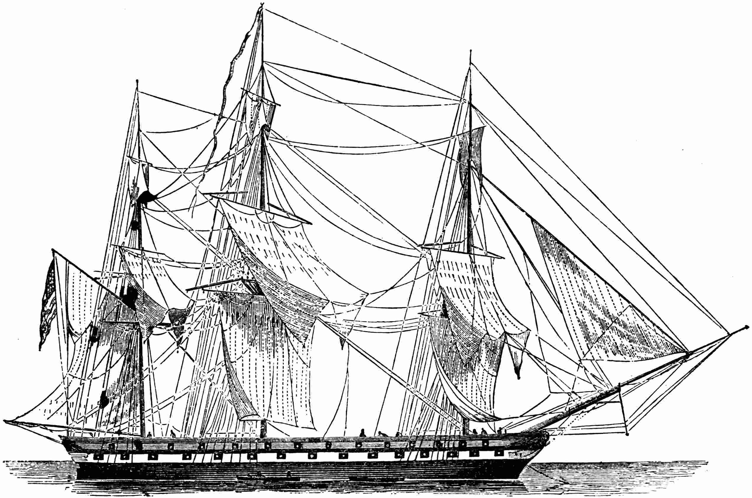 If a shot fired at the hull of a frigate happened to fly too high it might still seriously injure the rigging and spars, but if a shot was fired at the gun-boat and bounded over the hull it would do no damage because the spars of the gun-boat were not for use in time of battle.