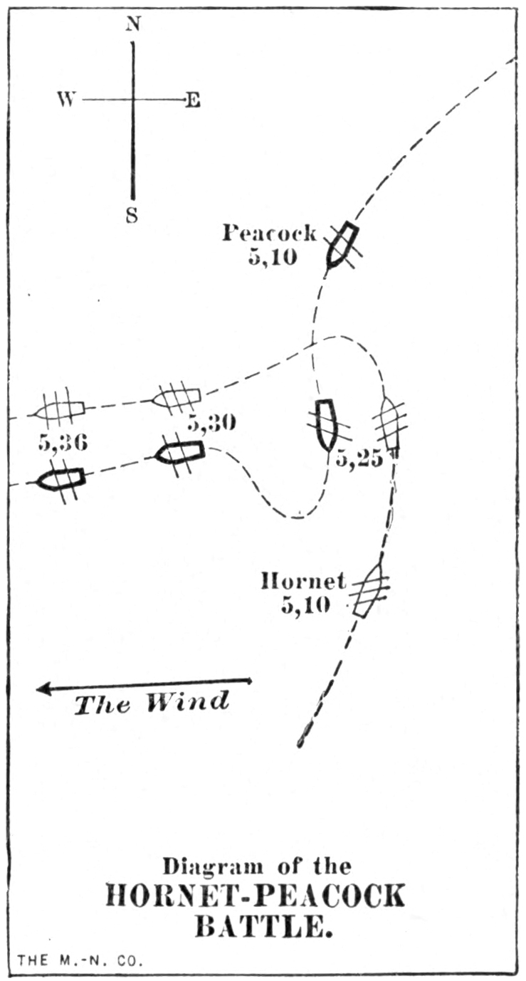 | The Remarkable Battle between the Yankee Hornet and the British Peacock—The British Ship was so Pretty she was Known as “The Yacht,” but her Gunners could not Hit the Broadside of the Hornet when the Ships were in Contact—As her Flag came Down a Signal of Distress went Up, for she was Sinking—The Efforts of two Crews could not Save her—“A Vessel Moored for the Purpose of Experiment could not have been sunk Sooner”—Infamous Treatment of American Seamen Repaid by the Golden Rule—Captain Greene, of the Bonne Citoyenne, did not dare Meet the Hornet. | |