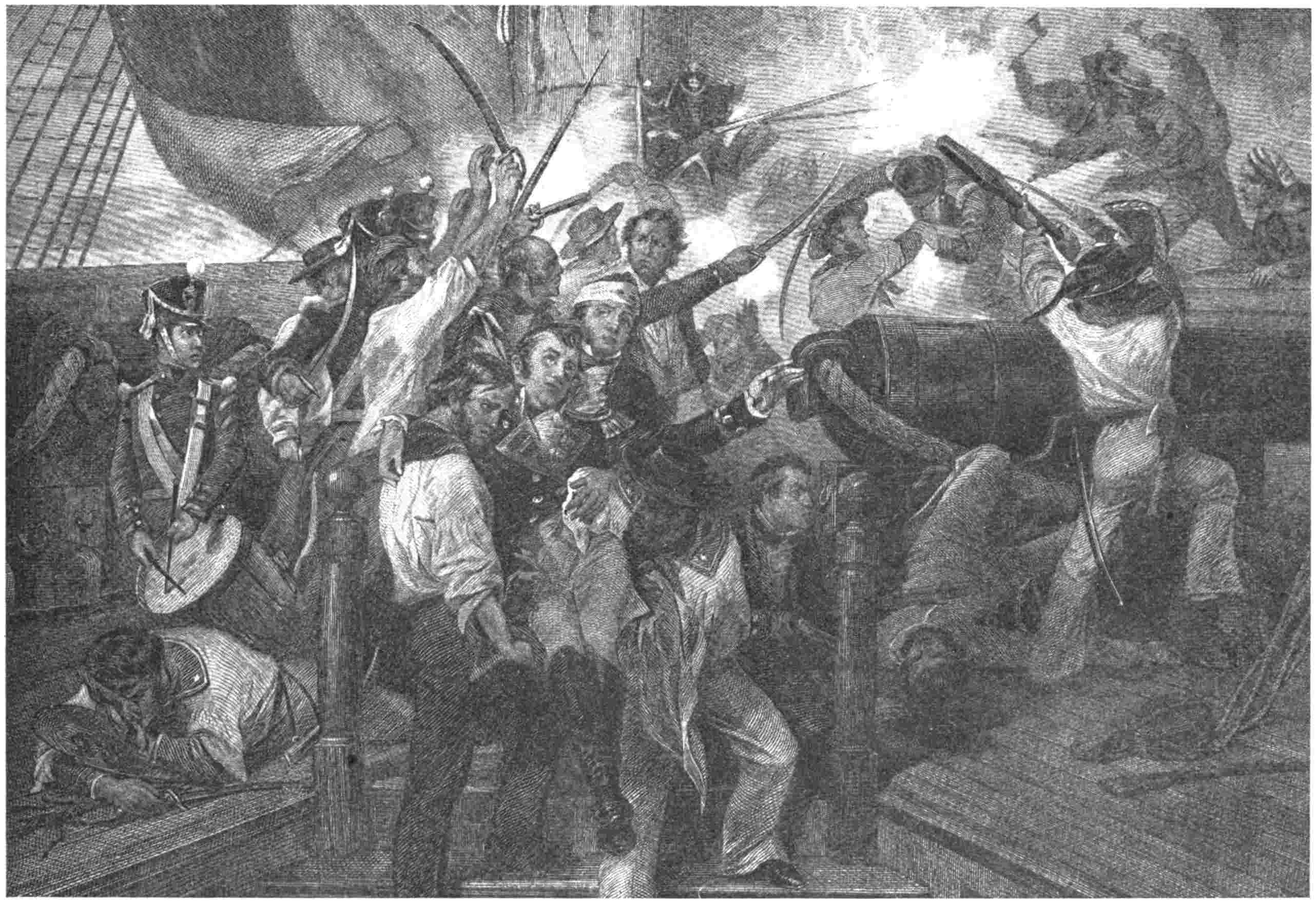 It is worth noting that on a considerable number of occasions during this war the Englishmen gave no quarter—it is worth noting as showing how greatly they were exasperated by their numerous defeats afloat. Indeed, after Barney’s attack on the Loire and Narcissus, British sailors (who were, it must be remembered, commanded by Admiral Sir George Cockburn), in their landing parties, not only robbed the defenceless citizens, but assaulted the women who happened to fall into their hands. And when they captured Washington,419 they not only destroyed such property as might be destroyed legitimately, but they repeated the universally execrated crime of Alexandria—they repeated the crime of which the fanatical priests of Spain were guilty among the civilized people of Yucatan—they deliberately burned the national library. The Knighted Admiral with his own hands took part in this work of destruction. Allen honors this British officer with a full-page engraving, in his history of the British Navy, only fifteen others being so distinguished in Volume II. of that work.