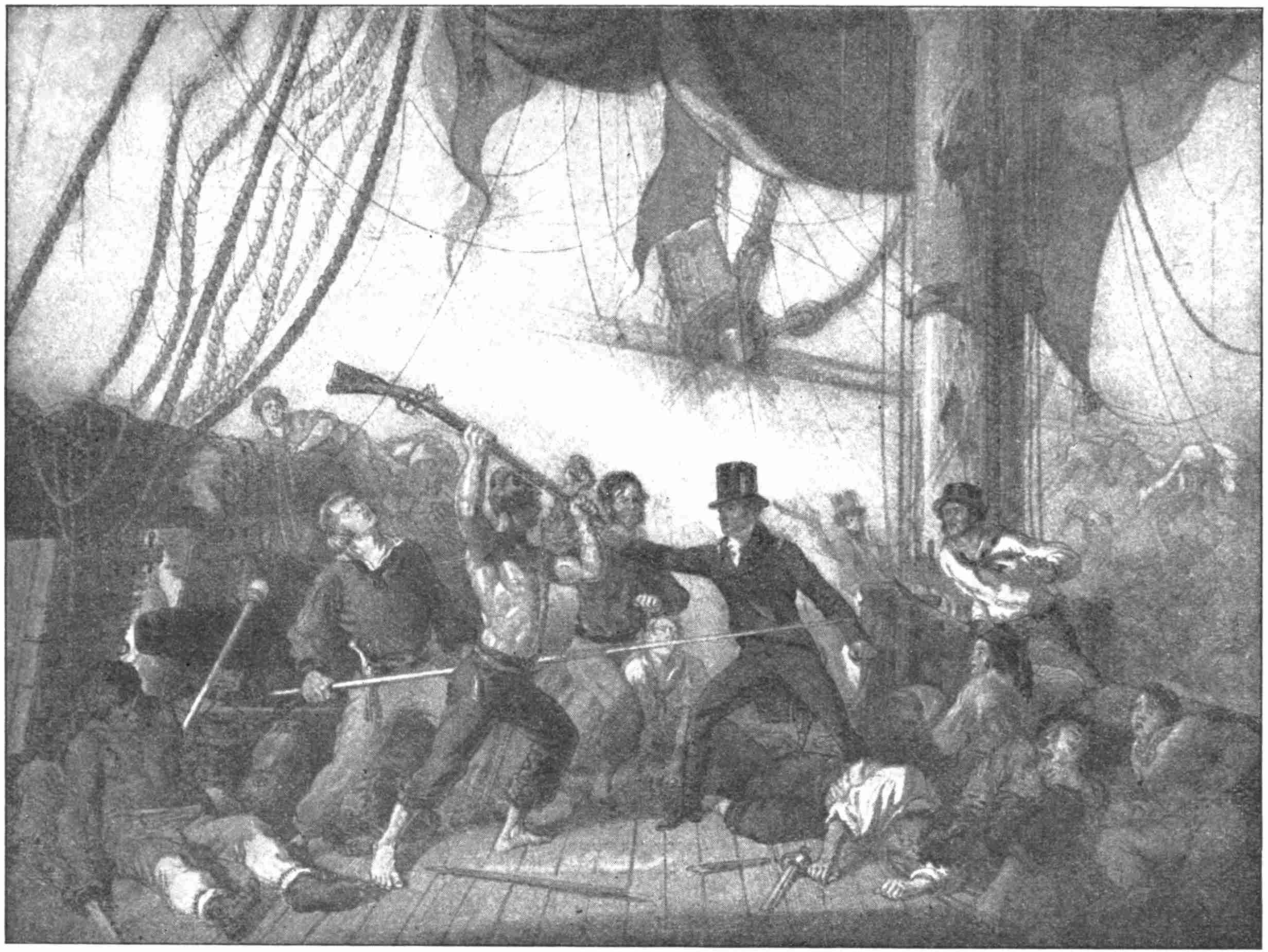 However, although the danger was imminent, no boat did actually turn over in this fight. But the rolling that was started kept the crew busy with the sweeps for several minutes before another shot could be fired.