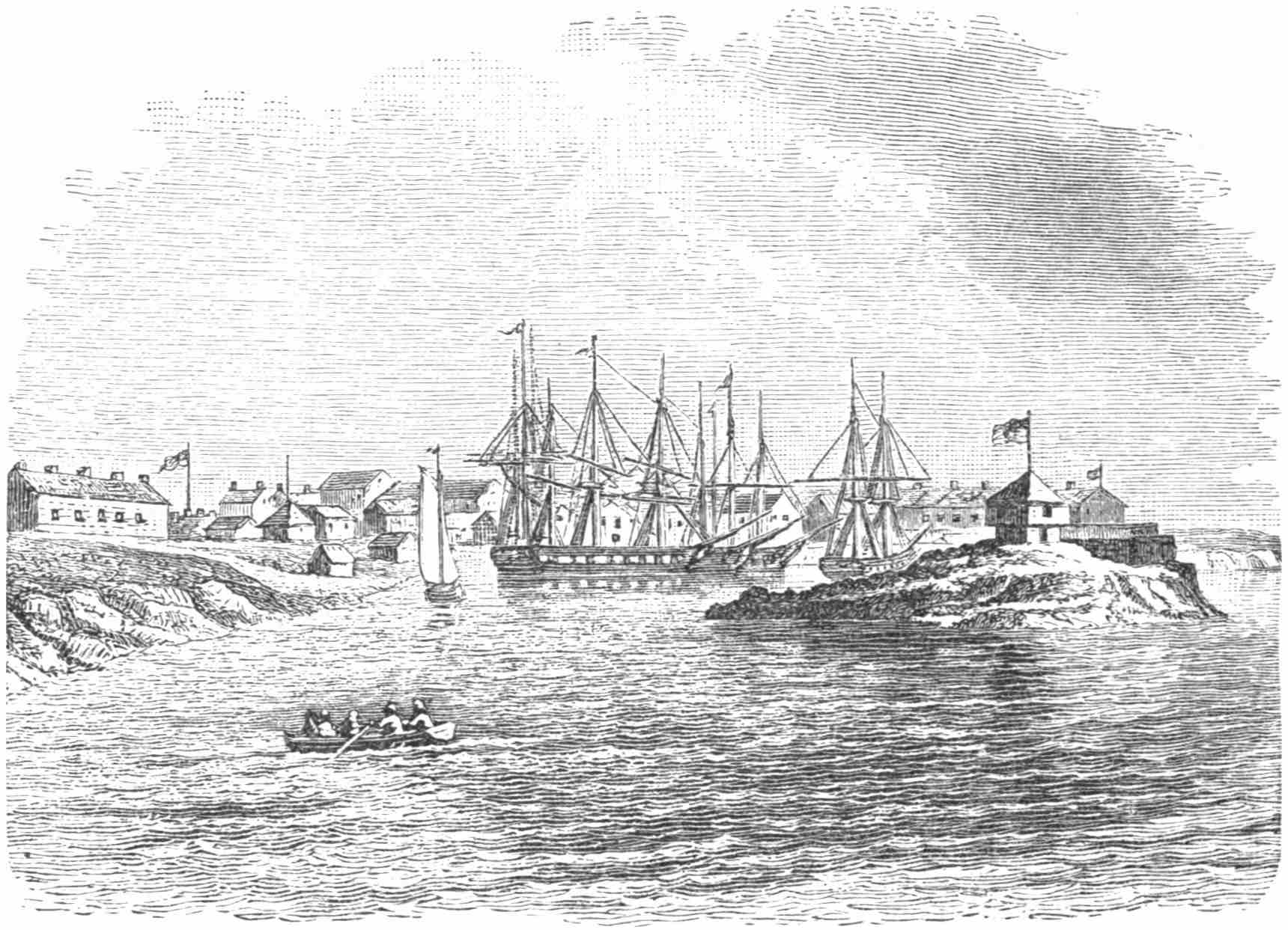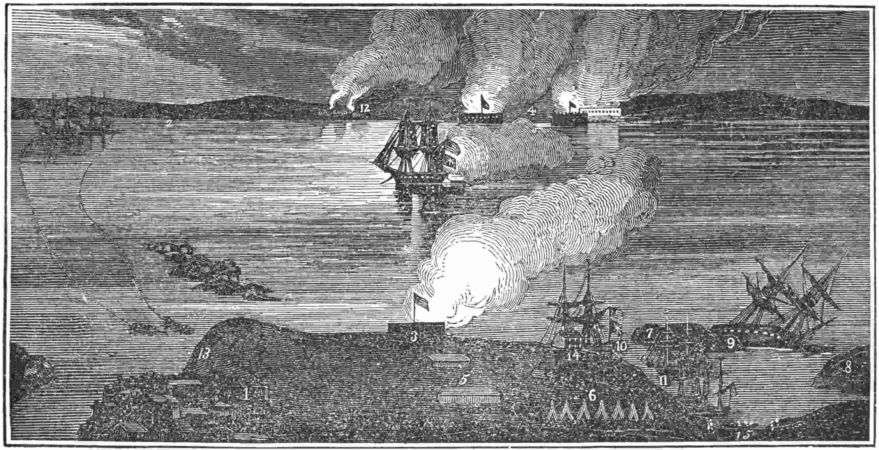 The occasion arose when, on June 22, 1813, three British seventy-four-gun ships-of-the-line, one sixty-four-gun ship, four frigates, two sloops, and three transports anchored off the island, and prepared to take possession. At that time the American frigate Constellation was blockaded at Norfolk (where she had been from the first), and her commander, Captain John Cassin, sent one hundred and fifty sailors and marines under Lieutenant H. B. Breckenridge to defend the fort. Lieutenants Neale, Shubrick, and Sanders were under Breckenridge. To whelm this tiny force the British came with seven hundred (James says seven hundred, so there were probably more) men in fifteen boats, the leader of the boats being a launch fifty feet long, called the Centipede, which was in charge of Captain Hanchett, of the Diadem, an illegitimate son of King George IV. The whole expedition was under the command of Captain Samuel John Pechell, the braggart who, in the Guerrière, painted her name on her foretop-sail, and then cruised up and down the Yankee399 coast, and finally took John Deguyo, an American citizen, from the American brig Spitfire when she was within the waters of New York Harbor on May 1, 1811.