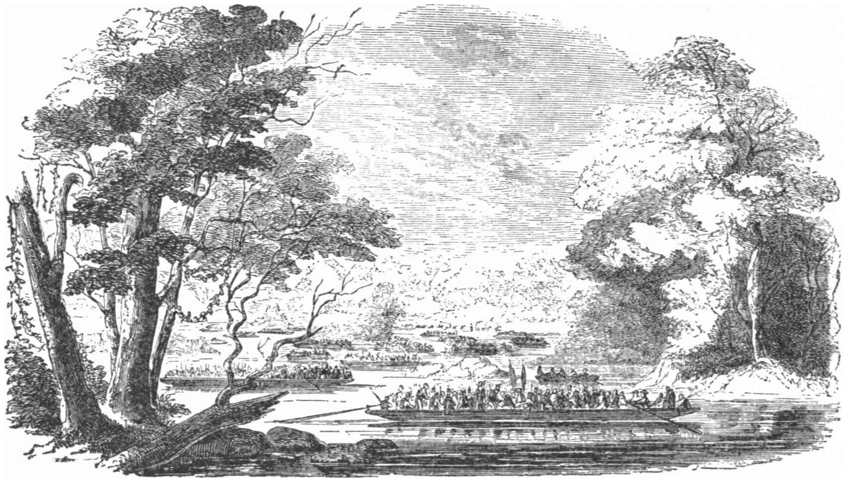 On the arrival of this addition to the British squadron in the Chesapeake, Captain Barney had his gun-boats in the Patuxent River, a branch of the Potomac. On the morning of June 8, 1814, a British frigate, a brig, two schooners, and fifteen barges were seen coming up the river looking for the Yankees. Captain Barney retreated two miles in order to get into water where the frigate could not follow, and then, at the mouth of St. Leonard’s Creek, anchored his boats in a line across the river.