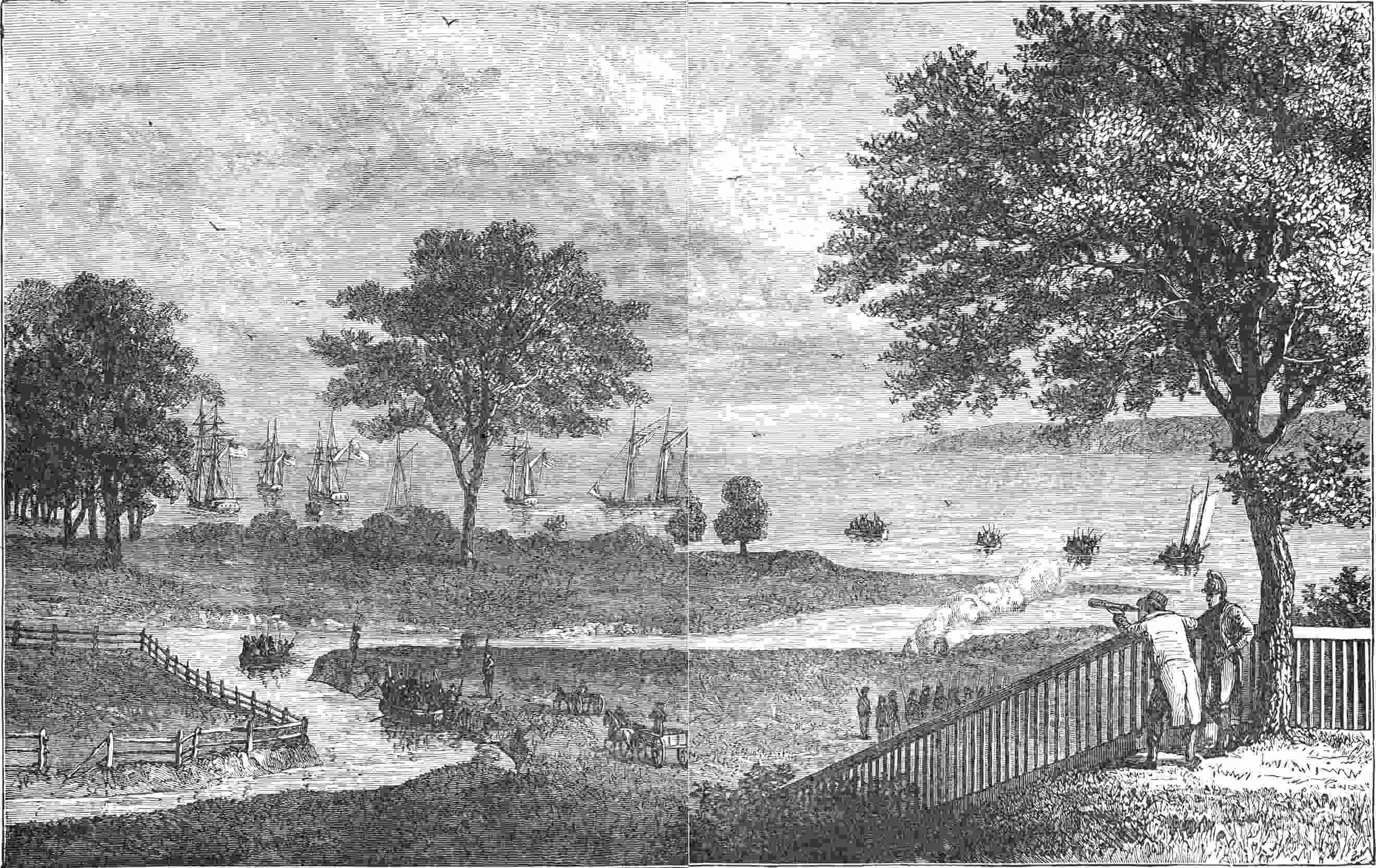 “After the severe chastisement inflicted upon them for their last attempt, the enemy made no farther effort to disturb the tranquillity of the flotilla, but contented themselves with converting the siege into a blockade, by mooring in the mouth of the creek, where they were soon reinforced by another frigate. Having come to this resolution, they turned their attention to the plunder of the surrounding country, in which frequent experience had given them expertness. Tobacco, slaves, farm-stock of all kinds, and household furniture, became the objects of their daily enterprises, and possession of them in large quantities was the reward of their achievements. What they could not conveniently carry away, they destroyed by burning. Unarmed, unoffending citizens were taken from their very beds—sometimes with beds and all—and carried on board their ships, from which many of them were not released until the close of the war.