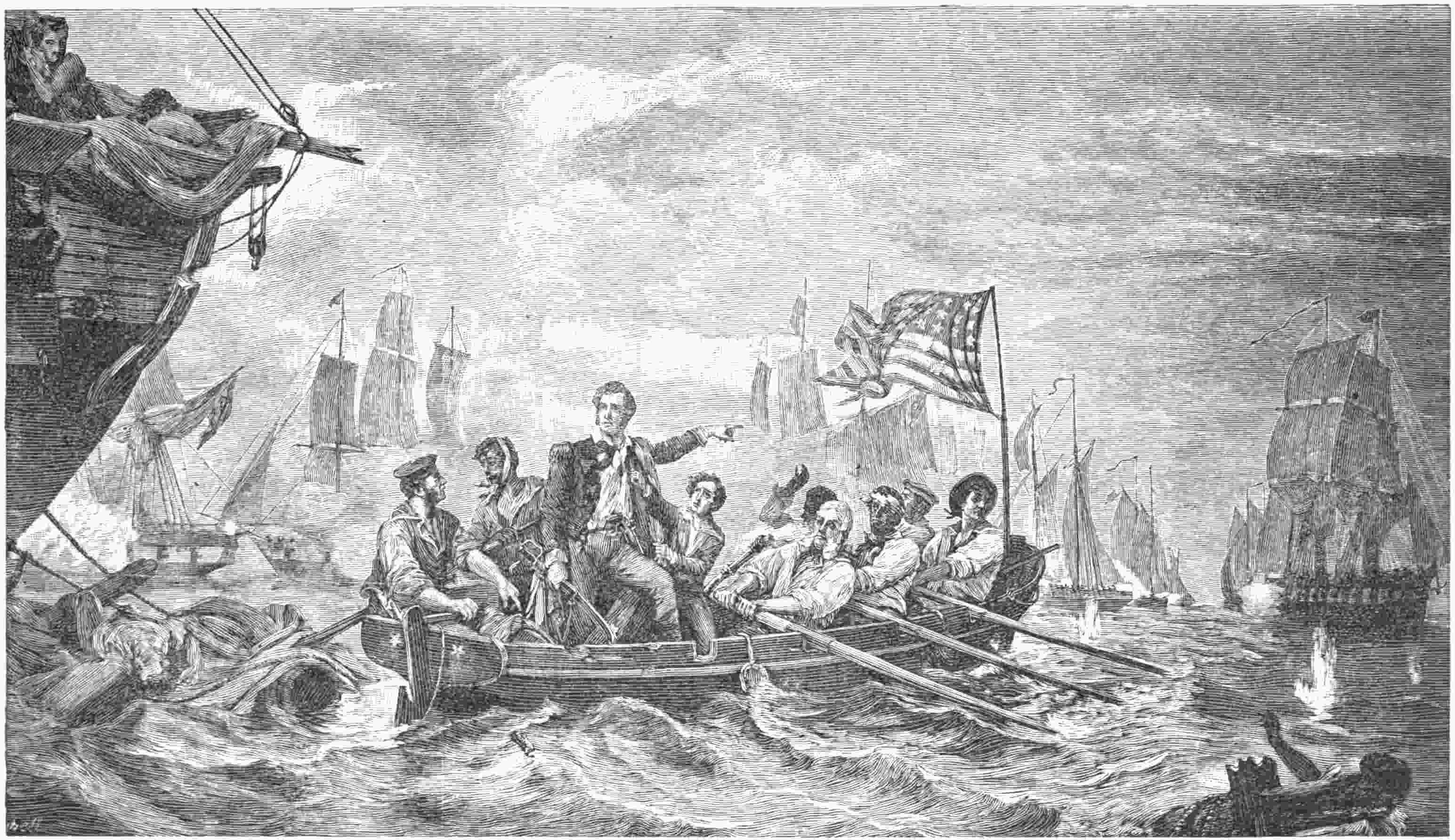 The enemy came on with the customary dash of British landing parties, but the Americans held their fire until the boats were within seventy yards, and then the well-charged battery was turned loose. At the first blast a round shot raked the Centipede, cutting off the legs of several of the men at the oars, severely bruising the thigh of Captain Hanchett, and sinking the boat. Two other big boats were sunk at the same round, and two more a moment later, but it was so shallow there that the thwarts of three of them were left above the water when they struck bottom. The crews leaped overboard, splashing their way to the other boats, and leaving behind dozens struggling in the throes of death and with the agony of lesser wounds. Seeing the advance checked, a party of the Americans, under Midshipman Josiah Tattnall, waded out among the boats, cutlasses in hand. When he saw Tattnall coming Captain Samuel John Pechell had had enough. He ordered a retreat, and led the way to safety. His hosts followed in disorder, leaving forty prisoners in the hands of the brave Tattnall, who was also able to drag three of the boats ashore.