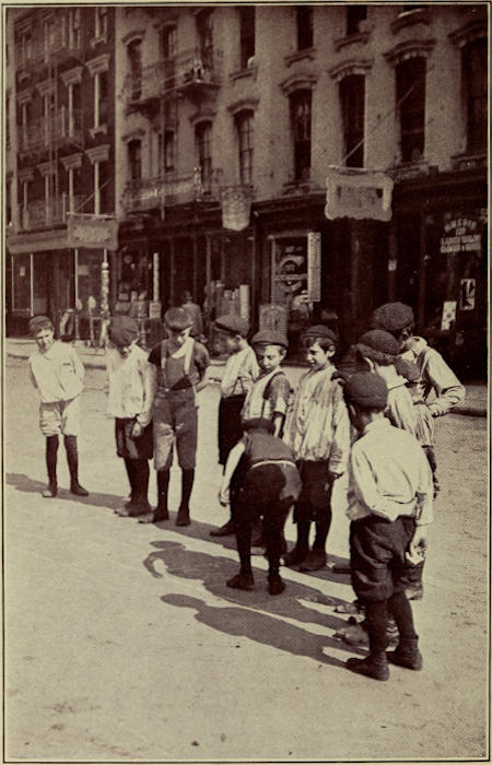 While it might seem that the child represents the most precious future wealth of our cities, he evidently is not so valued. Real estate is worth more than he is. Dirty, disease-breeding blocks that should be parks and playgrounds[74] are worth more than he is. Even where grass grows, big signs everywhere indicate that grass is sacred and of more account than he is. In planning our American cities the child seems to have been entirely left out. When tenements became profitable, and the tenements are the homes of the immigrant children, the backyard playground disappeared. The street is the only playground left and, cursed by drivers because the horses stumble over them, and by chauffeurs because they limit their speed, and chased by the police as a general nuisance, the children of the tenements are surely to be pitied.