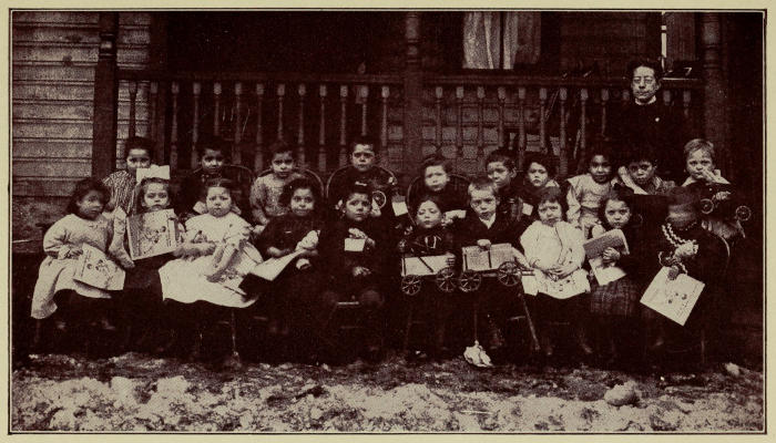 In the afternoon there is a mother’s meeting for Italians, or Hebrews, or some other nationality, with an address of a religious nature or a brief talk on some topic that helps make the mothers better able to care for their children. American boys and girls may think all mothers know how to take care of children, because their mothers took such good care of them. It would surprise them to know that in the fall some of the immigrant mothers sew a suit of clothes on their child and expect that suit to stay on through the winter—it is not to come off at night, either. Many Italian mothers wrap up their little babies until they look like a mummy that you may have seen in a museum. The baby can move its hands but not its feet; it can also move its big black eyes, and laugh or cry. We know better than these mothers, so we try to teach them wiser ways of caring for their children.
