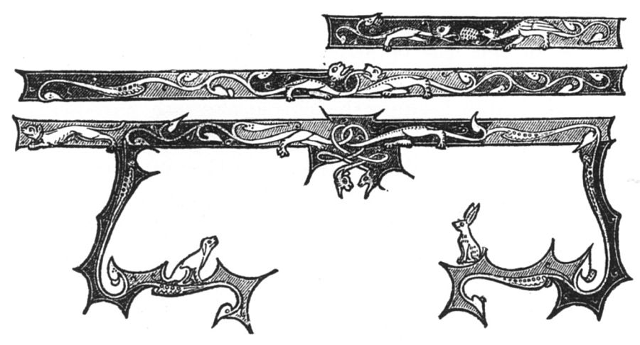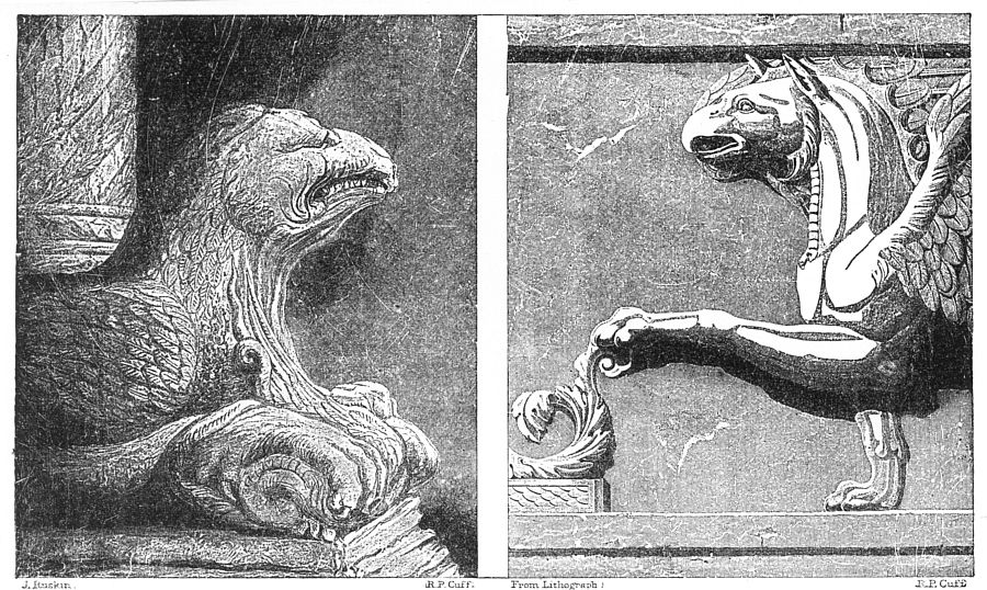 As, however, it is sometimes alleged by the opponents of my principles, that I have never done anything, it is proper that the reader should know exactly the amount of work for which I am answerable in these illustrations. When an example is given from any of the works of Turner, it is either etched by myself from the original drawing, or engraved from a drawing of mine, translating Turner's work out of color into black and white, as for instance, the frontispiece to the fourth volume. When a plate is inscribed as "after" such and such a master, I have always myself made the drawing, in black and white, from the original picture; as, for instance, Plate 11, in this volume. If it has been made from a previously existing engraving, it is inscribed with the name of the first engraver at the left-hand lowest corner; as, for instance, Plate 18, in Vol. IV. Outline etchings are either by my own hand on the steel, as Plate 12, here, and 20, 21, in Vol. IV.; or copies from my pen drawings, etched by Mr. Boys, with a fidelity for which I sincerely thank him; one, Plate 22, Vol. IV., is both drawn and etched by Mr. Boys from an old engraving. Most of the other illustrations are engraved from my own studies from nature. The colored Plate (7, in this volume) is from a drawing executed with great skill by my assistant, Mr. J. J. Laing, from MSS. in the British Museum; and the lithography of it has been kindly superintended by Mr. Henry Shaw, whose renderings of mediæval ornaments stand, as far as I know, quite unrivalled in modern art. The two woodcuts of mediæval design, Figs. 1 and 3, are also from drawings by Mr. Laing, admirably cut by Miss Byfield. I use this word "admirably," not with reference to mere delicacy of execution, which can usually be had for money, but to the perfect fidelity of facsimile, which is in general not to be had for money, and by which Miss Byfield has saved me all trouble with respect to the numerous woodcuts in the fourth volume; first, by her excellent renderings of various portions of Albert Durer's woodcuts; and, secondly, by reproducing, to their last dot or scratch, my own pen diagrams, drawn in general so roughly that few wood-engravers would have condescended to cut them with care, and yet always involving some points in which care was indispensable. One or two changes have been permitted in the arrangement of the book,xii which make the text in these volumes not altogether a symmetrical continuation of that in former ones. Thus, I thought it better to put the numbers of paragraphs always at the left-hand side of the page; and as the summaries, in small type, appeared to me for the most part cumbrous and useless, I have banished them, except where there were complicated divisions of subject which it seemed convenient to indicate at the margin. I am not sorry thus to carry out my own principle of the sacrifice of architectural or constructive symmetry to practical service. The plates are, in a somewhat unusual way, numbered consecutively through the two volumes, as I intend them to be also through the fifth. This plan saves much trouble in references.