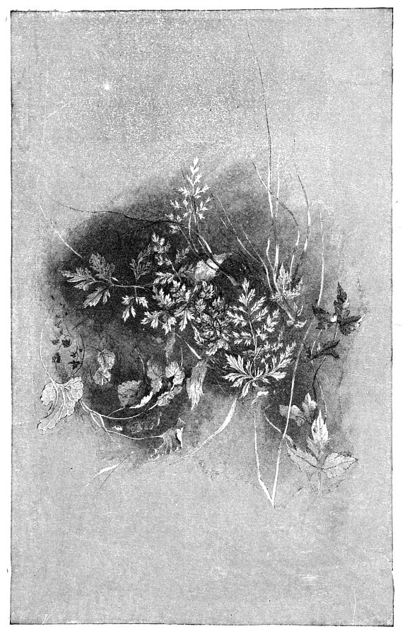 § 18. Although, however, this example is characteristic of Titian in its wildness, it is not so in its looseness. It is only in the distant backgrounds of the slightest work, or when he is in a hurry, that Titian is vague: in all his near and studied work he completes every detail with scrupulous care. The next Plate, 17., a background of Tintoret's, from his picture of the Entombment at Parma, is more entirely characteristic of the Venetians. Some mistakes made in the reduction of my drawing during the course of engraving have cramped the curves of the boughs and leaves, of which I will give the true outline farther on; meantime the subject, which is that described in § 16. of the chapter on Penetrative Imagination, Vol. II., will just as317 well answer the purpose of exemplifying the Venetian love of gloom and wildness, united with perfect definition of detail. Every leaf and separate blade of grass is drawn; but observe how the blades of grass are broken, how completely the aim at expression of faultlessness and felicity has been withdrawn, as contrary to the laws of the existent world.