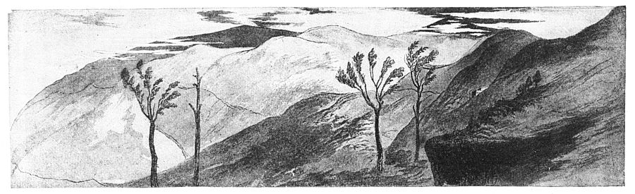 § 14. But be this as it may, the fact is, as ill luck would have it, that profanity of feeling, and skill in art, increased together; so that we do not find the backgrounds rightly painted till the figures become irreligious and feelingless; and hence we associate necessarily the perfect landscape with want of feeling. The first great innovator was either Masaccio or Filippino Lippi: their works are so confused together in the Chapel of the Carmine, that I know not to whom I may attribute,—or whether, without being immediately quarrelled with, and contradicted, I may attribute to anybody,—the landscape background of the fresco of the Tribute Money. But that background, with one or315 two other fragments in the same chapel, is far in advance of all other work I have seen of the period, in expression of the rounded contours and large slopes of hills, and the association of their summits with the clouds. The opposite engraving will give some better idea of its character than can be gained from the outlines commonly published; though the dark spaces, which in the original are deep blue, come necessarily somewhat too harshly on the eye when translated into light and shade. I shall have occasion to speak with greater speciality of this background in examining the forms of hills; meantime, it is only as an isolated work that it can be named in the history of pictorial progress, for Masaccio died too young to carry out his purposes; and the men around him were too ignorant of landscape to understand or take advantage of the little he had done. Raphael, though he borrowed from him in the human figure, never seems to have been influenced by his landscape, and retains either, as in Plate 11., the upright formalities of Perugino; or, by way of being natural, expands his distances into flattish flakes of hill, nearly formless, as in the backgrounds of the Charge to Peter and Draught of Fishes; and thenceforward the Tuscan and Roman schools grew more and more artificial, and lost themselves finally under round-headed niches and Corinthian porticos.