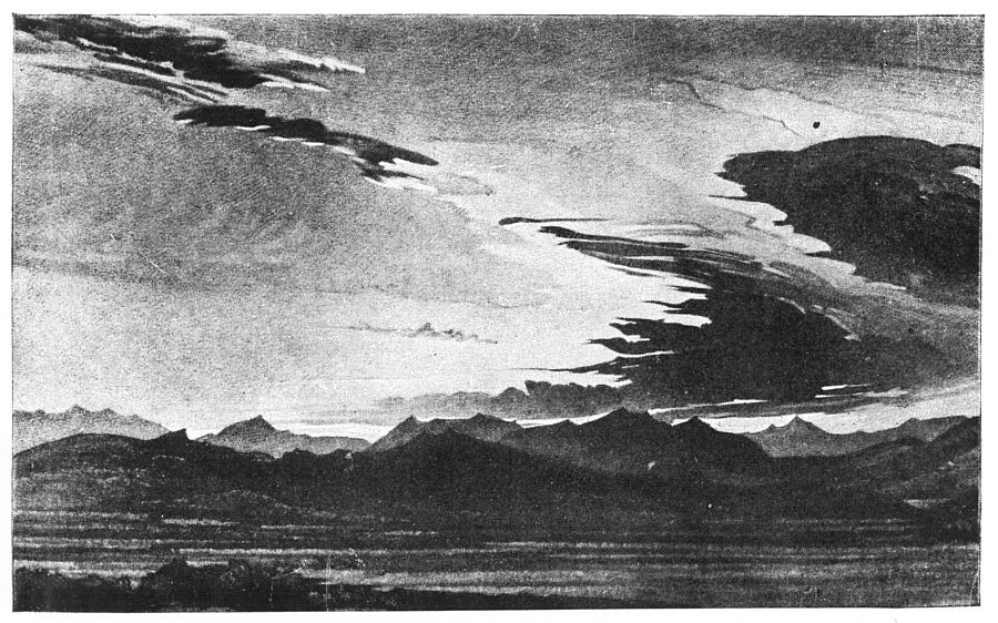 § 15. It needed, therefore, the air of the northern mountains and of the sea to brace the hearts of men to the development of the true landscape schools. I sketched by chance one evening the line of the Apennines from the ramparts of Parma, and I have put the rough note of it, and the sky that was over it, in Plate 14., and next to this (Plate 15.) a moment of sunset, behind the Euganean hills at Venice. I shall have occasion to refer to both hereafter; but they have some interest here as types of the kind of scenes which were daily set before the eyes of Correggio and Titian, and of the sweet free spaces of sky through which rose and fell, to them, the colored rays of the morning and evening.