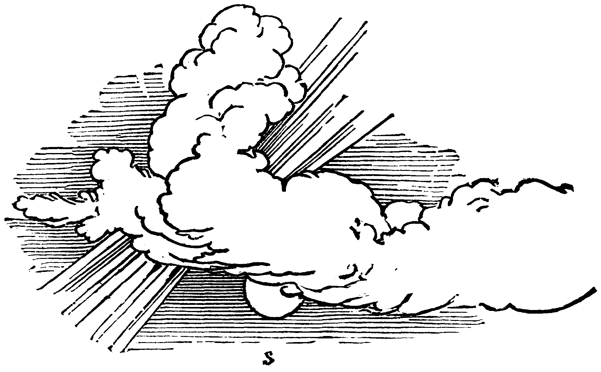 § 22. Not so Claude, who may be considered as Turner's principal master. Claude's capacities were of the most limited kind; but he had tenderness of perception, and sincerity of purpose, and he effected a revolution in art. This revolution consisted mainly in setting the sun in heaven.[100] Till Claude's time no one had seriously thought of painting the sun but conventionally; that is to say, as a red or yellow star, (often) with a face in it, under which type it was constantly represented in illumination; else it was kept out of the picture, or introduced in fragmentary distances, breaking through clouds with almost definite rays. Perhaps the honor of having first tried to represent the real effect of the sun in landscape belongs to Bonifazio, in his pictures of the camps of Israel.[101] Rubens followed in a kind of bravado, sometimes making the rays issue from anything but the orb of the sun;—here, for instance, Fig. 6., is an outline of the position of the sun (at s) with respect to his own rays, in a sunset behind a tournament in the Louvre: and various interesting effects of sunlight issuing from the conventional face-filled orb occur in contemporary missal-painting; for instance, very richly in the Harleian MS. Brit. Mus. 3469. But all this was merely indicative of the tendency to transition which may always be traced in any age before the man comes who is to accomplish the transition. Claude took up the new idea seriously, made the sun his subject, and painted the effects of misty shadows cast by his rays over the landscape, and other delicate aerial transitions, as no one had ever done before, and, in some respects, as no one has done in oil color since.