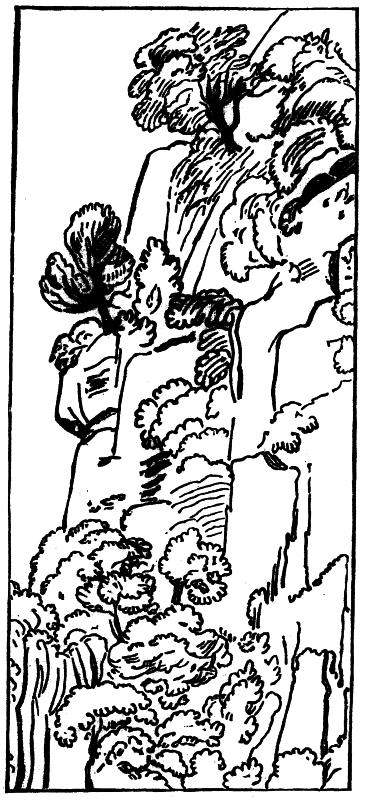 322§ 27. And yet, exquisite as is Claude's instinct for blunder, he has not strength of mind enough to blunder in a wholly original manner, but he must needs falter out of his way to pick up other people's puerilities, and be absurd at second-hand. I have been obliged to laugh a little—though I hope reverently—at Ghirlandajo's landscapes, which yet we saw had a certain charm of quaintness in them when contrasted with his grand figures; but could any one have believed that Claude, with all the noble landscapes of Titian set before him, and all nature round about him, should yet go back to Ghirlandajo for types of form. Yet such is the case. I said that the Venetian influence came dimly down to Claude; but the old Florentine influence came clearly. The Claudesque landscape is not, as so commonly supposed, an idealized abstract of the nature about Rome. It is an ultimate condition of the Florentine conventional landscape, more or less softened by reference to nature. Fig. 8., from No. 145. of the Liber Veritatis, is sufficiently characteristic of Claude's rock-drawing; and compared with Fig. 5. (p. 314), will show exactly the kind of modification he made on old and received types. We shall see other instances of it hereafter.