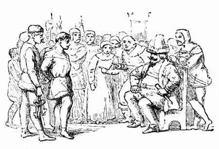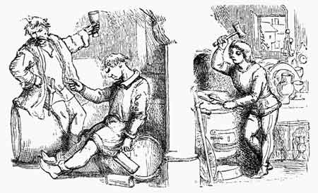 The youngest brother, Gluck, was as completely opposed, in both appearance and character, to his seniors as could possibly be imagined or desired. He was not above twelve years old, fair, blue-eyed, and kind in temper to every living thing. He did not, of course, agree particularly well with his brothers, or rather, they did not agree with him. He was usually appointed to the honourable office of turnspit, when there was anything to roast, which was not often; for, to do the brothers justice, they were hardly less sparing upon themselves than upon[Pg 12] other people. At other times he used to clean the shoes, floors, and sometimes the plates, occasionally getting what was left on them, by way of encouragement, and a wholesome quantity of dry blows, by way of education.