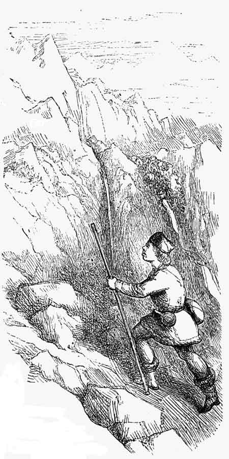 His way now lay straight up a ridge of bare red rocks, without a blade of grass to ease the foot, or a projecting angle to afford an inch of shade from the south sun. It was past noon, and the rays beat intensely upon the steep path, while the whole atmosphere was motionless, and penetrated with heat. Intense thirst was soon added to the bodily fatigue with which Hans was now afflicted; glance after[Pg 40] glance he cast on the flask of water which hung at his belt. "Three drops are enough," at last thought he; "I may, at least, cool my lips with it."