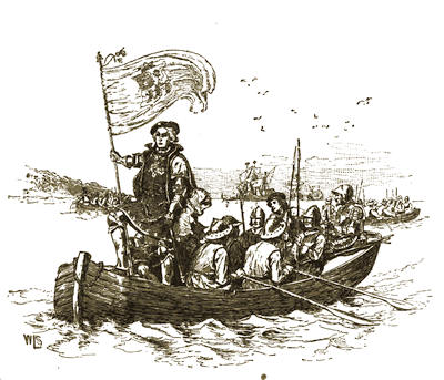 | “The admiral was splendidly robed in a brilliant scarlet cloak over his rich and glittering armor, and held the royal standard in his own hand” | ” | 154 |