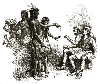 So they hastened up the river farther, and waited there until they should see if the men would land, or take the water out of the river at the middle, which they might do if they were afraid of the natives. But it seemed that the men were not afraid of the Indians, and rowed up the river to where a small stream emptied into it, and there they went ashore.