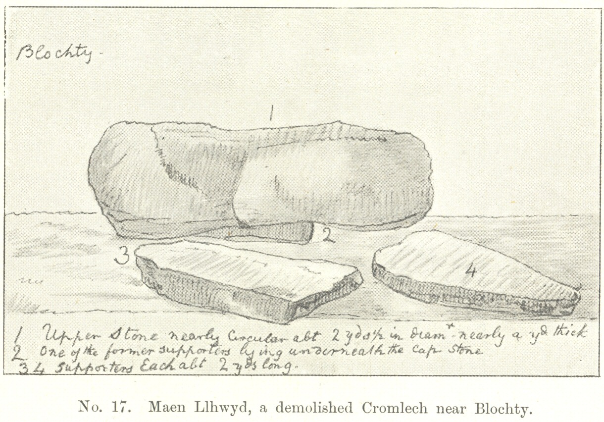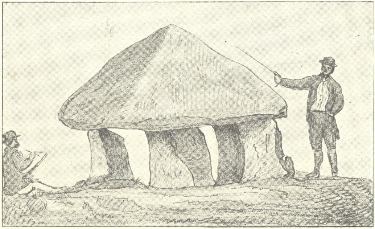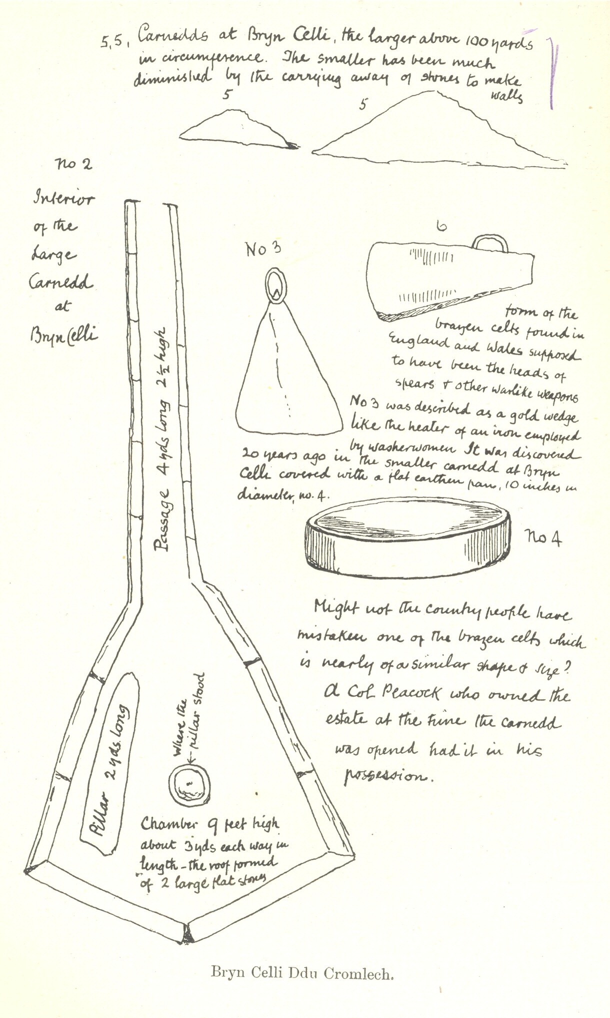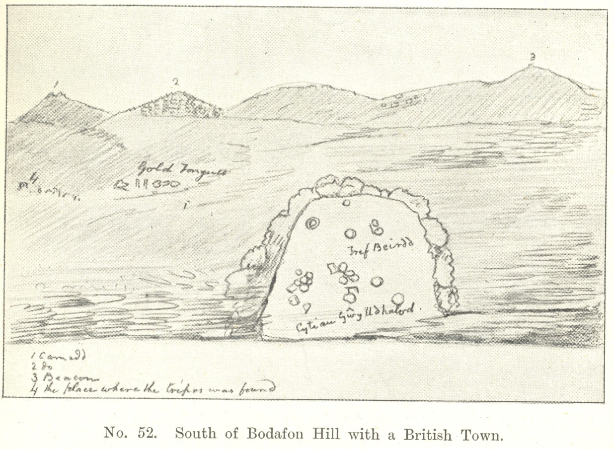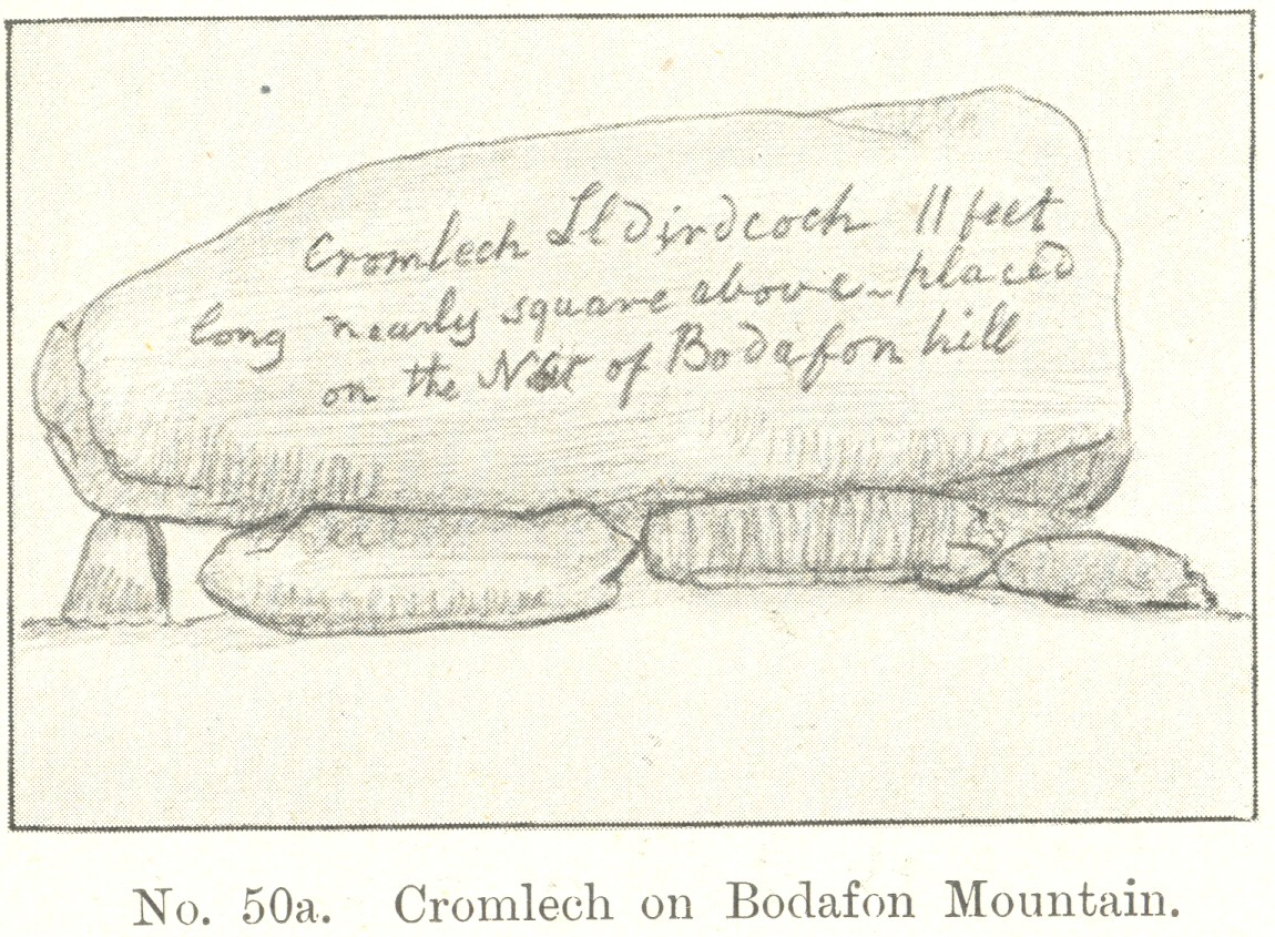 When arrived at Bodafon hills a ridge of rocky ground (fol. 117a) extending nearly two miles east and west Mr. Richards gave his horse to our attendant and accompanied us to a cromlech lying at the side of the hill denominated cromlech Lldercoch [73] nearly square the upper stone being about eleven feet across supported by four or five small uprights not above a foot and a half from the surface. This is by no means so perfect as some we have before noticed. Had not Mr. Richards been positive of the fact I should have doubted whether it had been designed for one. Arrived nearly at the summit of the hill we entered a cottage inhabited by a countryman whose grandfather p. 74and great grandfather resided there before him. Under the direction of this person we climbed to the top of the hill to look at a Carnedd. Most of the loose stones have been removed but some of the flat ones which composed the cistfaen are still on the spot, another more perfect lies about an hundred (fol. 118) yards to the eastward of this, a third further beyond which we did not visit. In the course of our walk the countryman pointed to a spot where he said his grand-mother whilst tending the cattle found a large triangular [74] piece of gold as he called it, standing on three supporters weighing nearly forty pounds. The antique overgrown with heath but one of the beasts happening p. 75to tread upon it occasioned the discovery. This she sold for three shillings at Llanerchymedd.