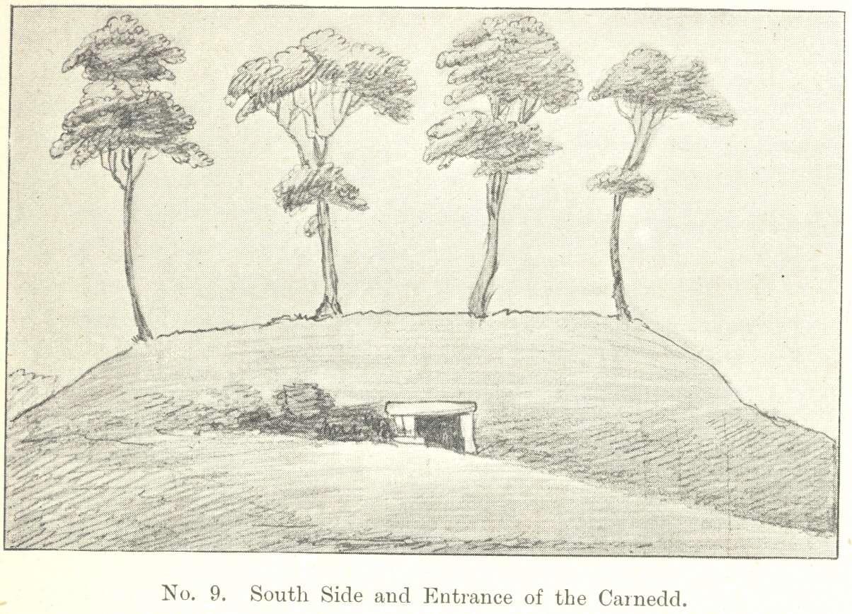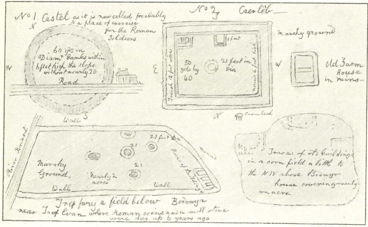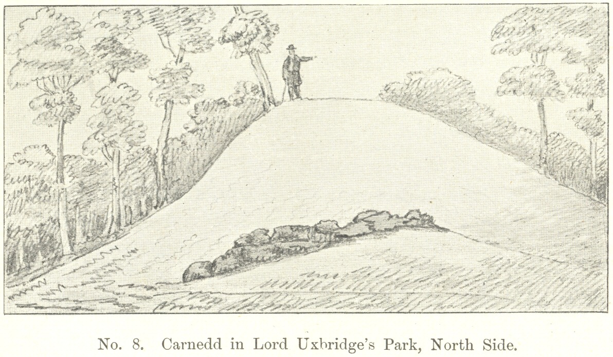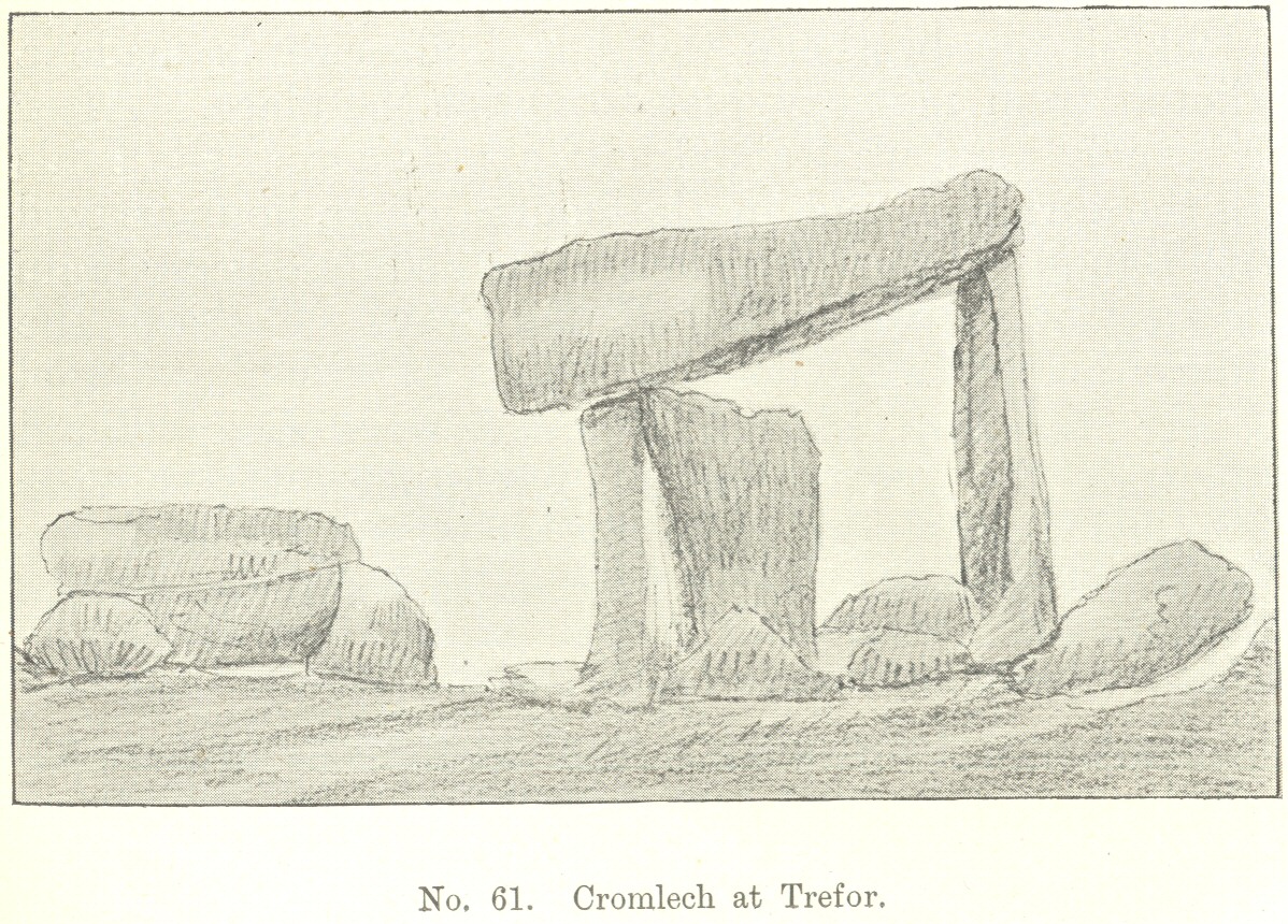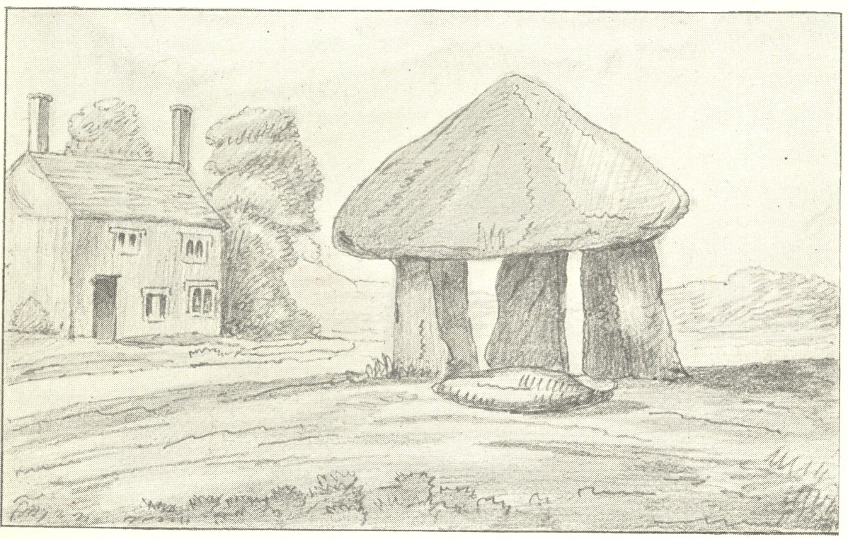 When arrived at Bodafon hills a ridge of rocky ground (fol. 117a) extending nearly two miles east and west Mr. Richards gave his horse to our attendant and accompanied us to a cromlech lying at the side of the hill denominated cromlech Lldercoch [73] nearly square the upper stone being about eleven feet across supported by four or five small uprights not above a foot and a half from the surface. This is by no means so perfect as some we have before noticed. Had not Mr. Richards been positive of the fact I should have doubted whether it had been designed for one. Arrived nearly at the summit of the hill we entered a cottage inhabited by a countryman whose grandfather p. 74and great grandfather resided there before him. Under the direction of this person we climbed to the top of the hill to look at a Carnedd. Most of the loose stones have been removed but some of the flat ones which composed the cistfaen are still on the spot, another more perfect lies about an hundred (fol. 118) yards to the eastward of this, a third further beyond which we did not visit. In the course of our walk the countryman pointed to a spot where he said his grand-mother whilst tending the cattle found a large triangular [74] piece of gold as he called it, standing on three supporters weighing nearly forty pounds. The antique overgrown with heath but one of the beasts happening p. 75to tread upon it occasioned the discovery. This she sold for three shillings at Llanerchymedd.